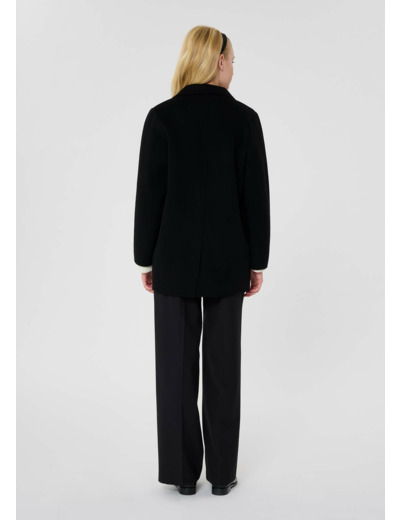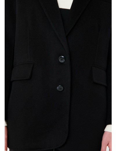 Cette veste noire en laine double face possède une coupe droite et oversized, un col à revers et des manches longues. Elle a deux grandes poches aux côtés et une poche à la poitrine sur laquelle est brodé le monogramme de la maison. Elle se ferme par deux boutons ton sur ton audevant.