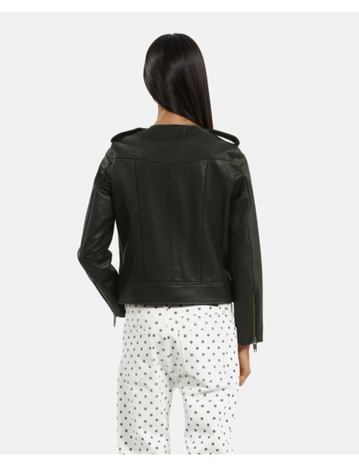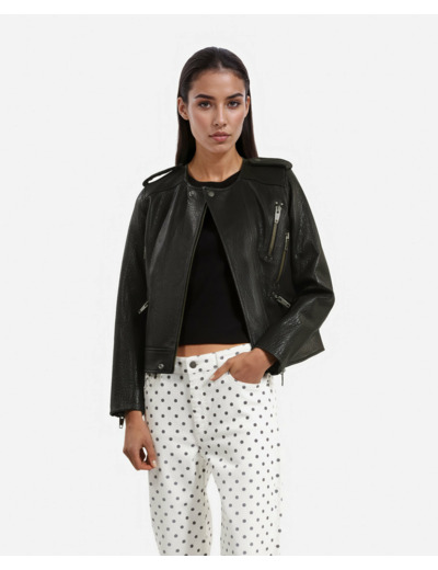 Confectionné en cuir mouton de qualité, ce blouson épouse parfaitement la silhouette grâce à sa coupe ajustée et son col rond épuré. Les détails comme les pattes d’épaule et les zips aux manches et poches apportent une touche moderne et fonctionnelle, idéale pour un look urbain et raffiné. Son design minimaliste et ses finitions soignées en font un incontournable du dressing féminin.