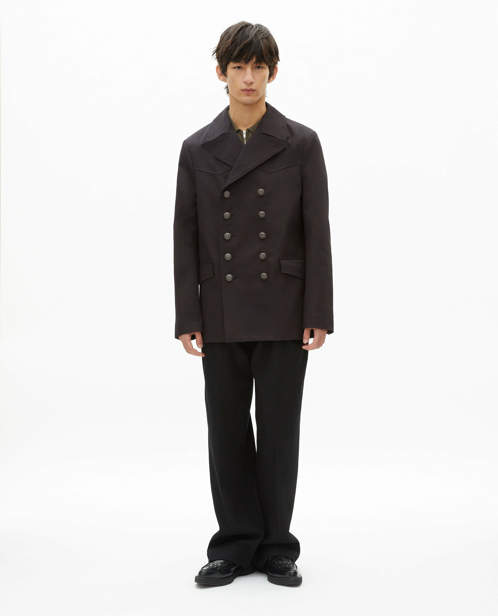 Confectionné en coton de qualité, ce manteau offre une coupe droite qui structure la silhouette sans contrainte. Son col cranté et la découpe western apportent une touche d’originalité maîtrisée, tandis que la fermeture double boutonnage et les poches à rabats renforcent son caractère pratique et raffiné. Les boutons en corne aux manches et le bas à volet au dos soulignent l’attention portée aux finitions.