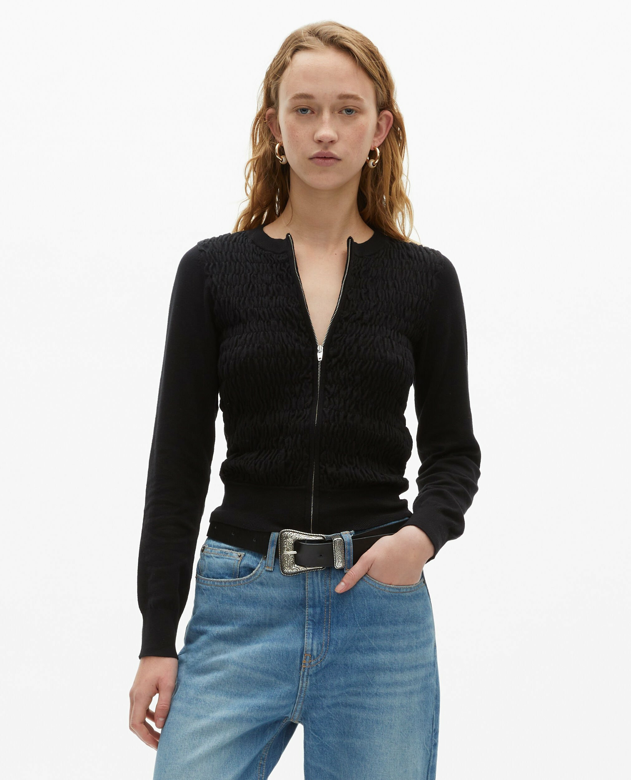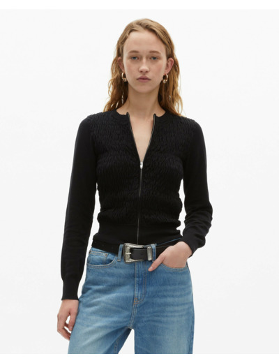 Adoptez l’élégance décontractée avec ce cardigan zippé signé The Kooples, pensé pour sublimer votre silhouette au quotidien. Sa coupe ajustée et son devant smocké apportent une touche moderne à un classique intemporel.