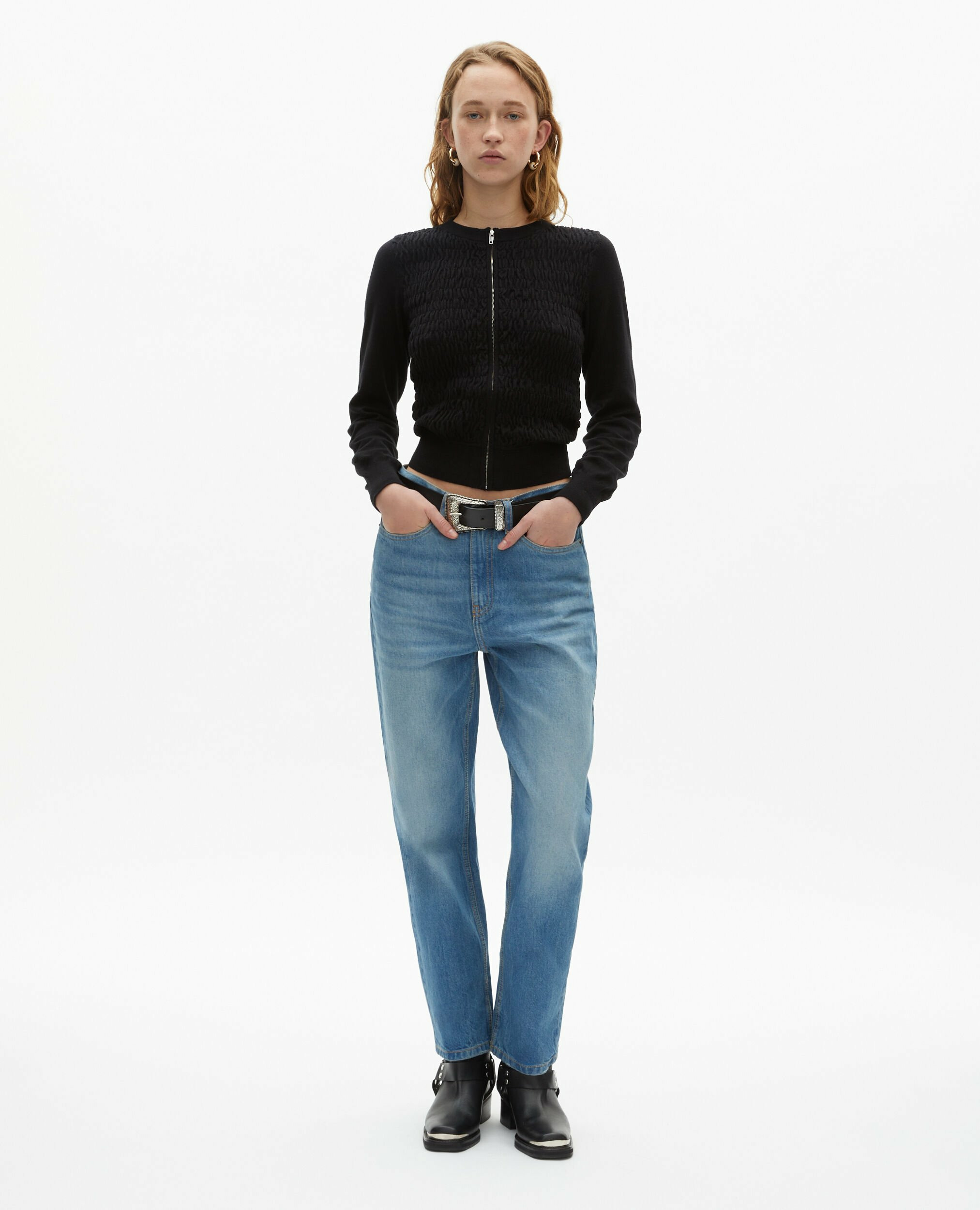 100% coton. Entretien facile. Coupe ajustée avec fermeture zippée. Devant smocké pour un effet texturé. Manches longues et bords côtes pour une finition soignée. Conseil taille : prendre une taille au-dessus en cas de doute.