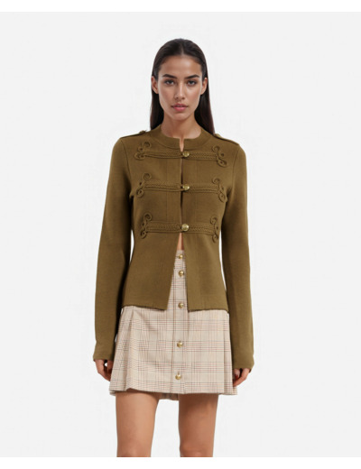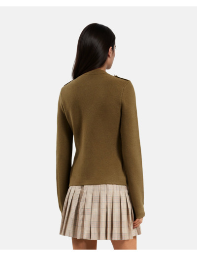 Confectionné en laine et coton, ce cardigan femme se distingue par son col officier et ses pattes d’épaule qui apportent structure et caractère. Le boutonnage devant, orné de boutons héritage, ainsi que les brandebourgs raffinés, soulignent un style unique et affirmé. Sa coupe droite assure une allure fluide, tandis que les manches longues offrent une protection idéale contre les fraîches journées.