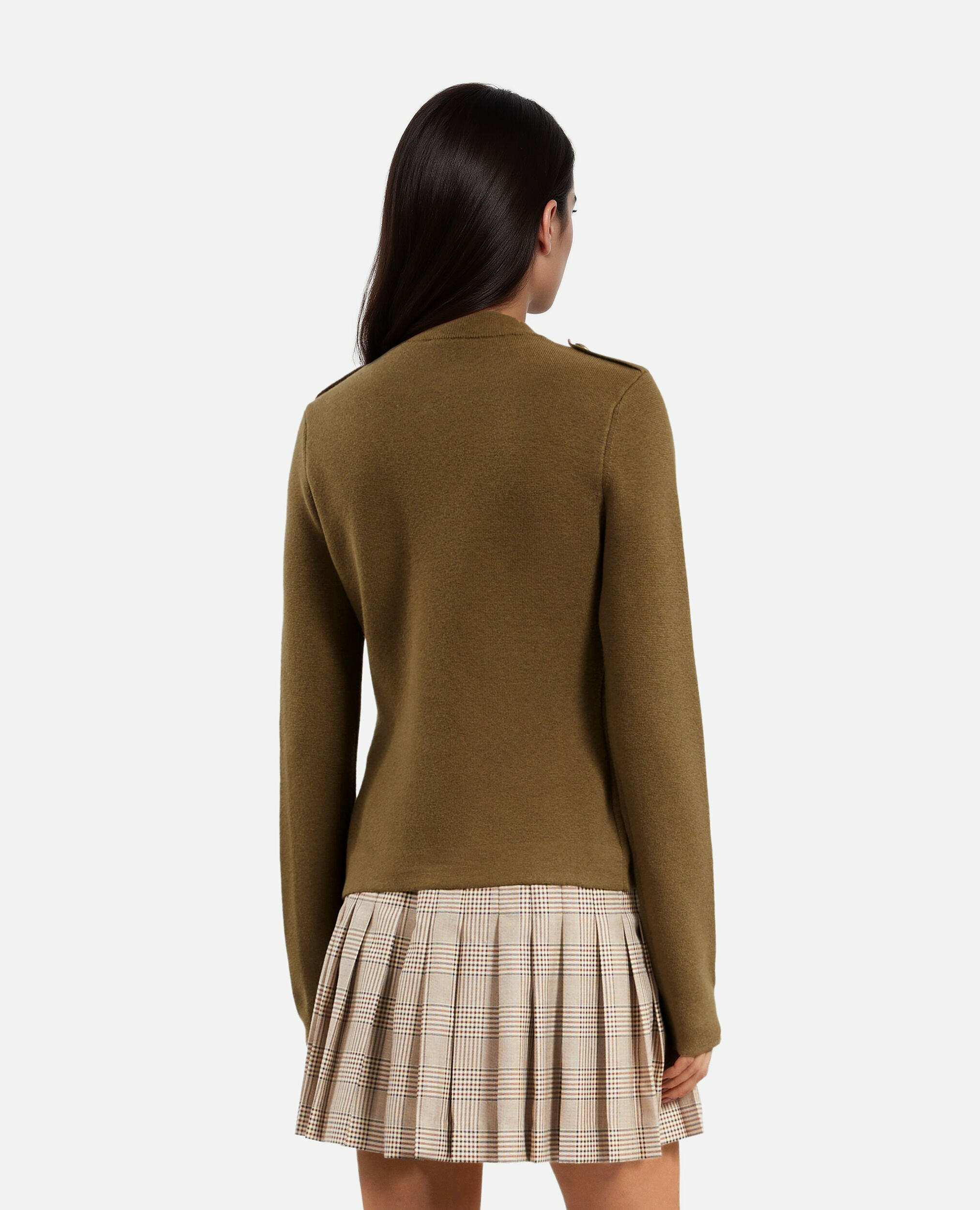 Ce cardigan à coupe droite se distingue par son col officier et ses pattes d’épaule qui apportent une touche militaire subtile et sophistiquée. Les manches longues et le boutonnage devant, agrémenté de boutons héritage, renforcent son caractère unique. La coupe ajustée souligne délicatement la silhouette, tandis que les brandebourgs ajoutent un détail d’exception, parfait pour une allure soignée en toute occasion.
