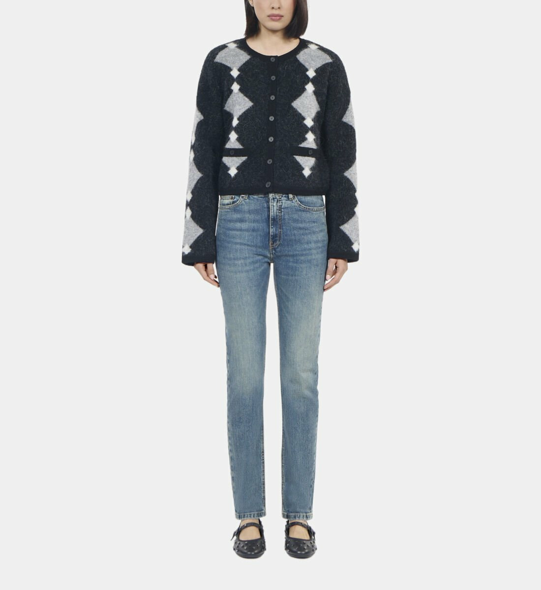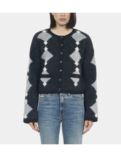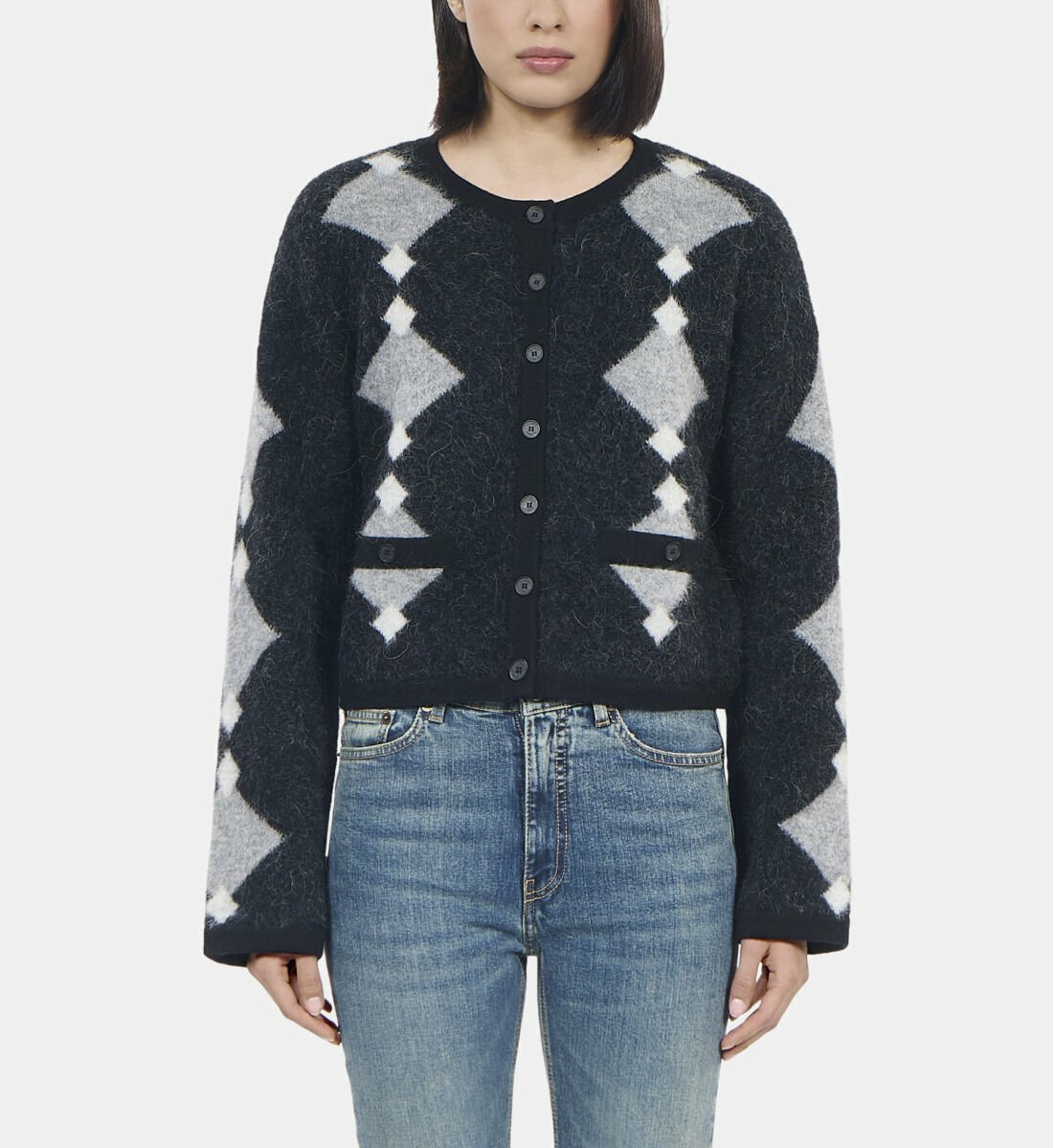 Confectionné dans une laine d’alpaga douce et légère, ce cardigan se distingue par son motif losanges subtil et moderne. Sa coupe ajustée valorise la silhouette sans sacrifier la liberté de mouvement. Parfait pour les journées fraîches, il s’associe aussi bien à un jean qu’à une jupe pour un look urbain et sophistiqué.