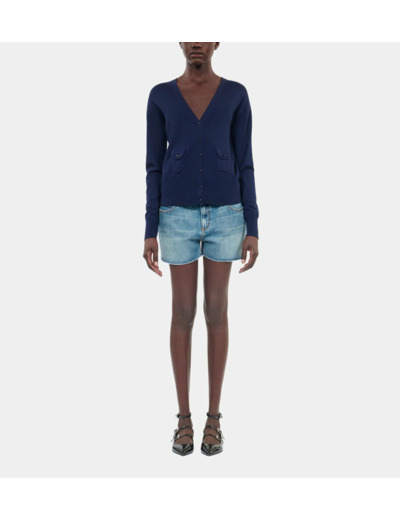 Adoptez l’élégance intemporelle du cardigan en laine bleu marine signé The Kooples. Une pièce essentielle qui allie confort et style avec une simplicité maîtrisée.