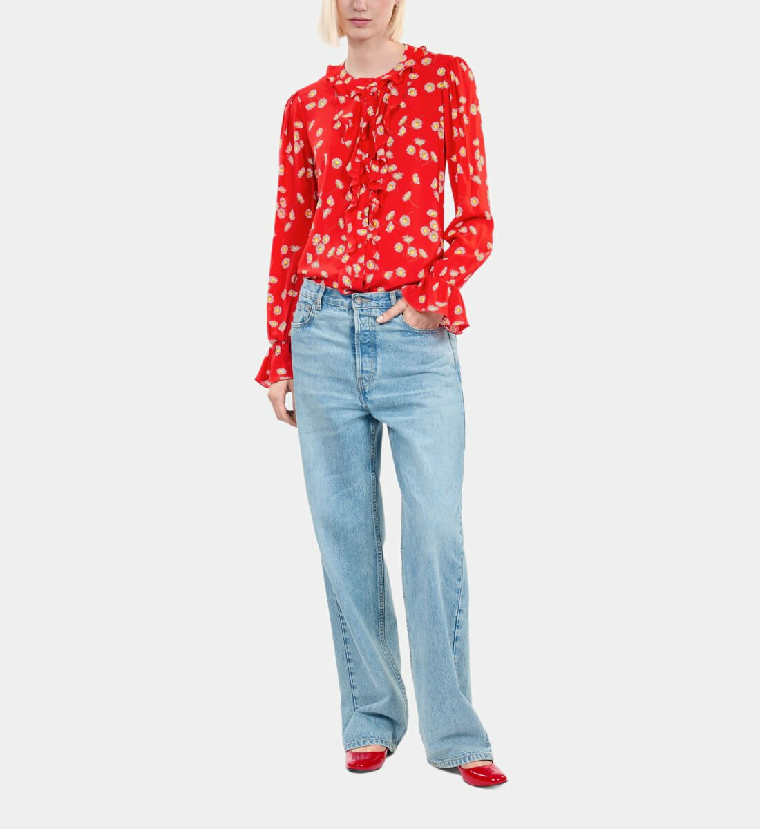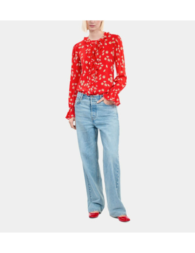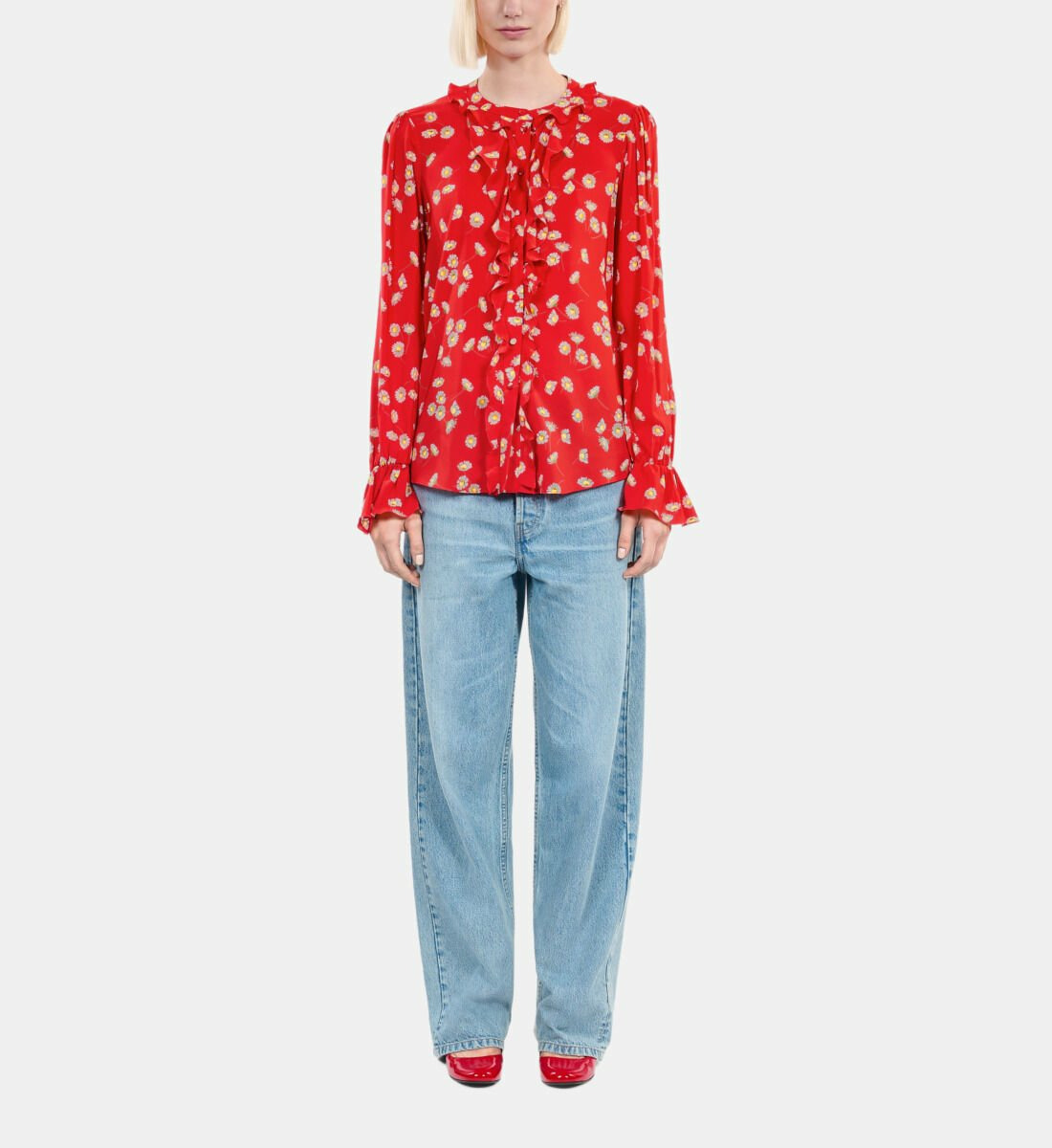 Conçue dans une coupe ample, cette chemise se distingue par son imprimé floral rouge et blanc, vibrant et raffiné. Le col rond et les poignets élastiqués ornés de volants apportent une touche de légèreté et de mouvement, tandis que la patte de boutonnage simple et les boutons recouverts assurent une finition soignée et discrète. Manches longues pour un porté confortable en toute saison.