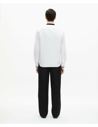 Conçue pour l’homme contemporain, cette chemise ajustée se distingue par son col officier épuré et ses détails subtils comme le ruban contrasté au col et aux manches. Sa coupe près du corps souligne la silhouette sans sacrifier le confort, tandis que les boutons blancs et le rivet au bas des manches apportent une touche de caractère discrète.