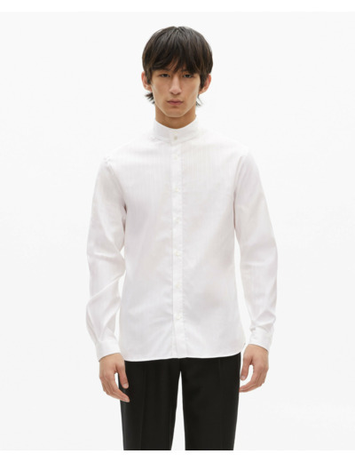 Conçue pour l’homme contemporain, cette chemise allie élégance et confort grâce à son col montant et sa coupe droite. Les manches longues et les rivets aux poignets soulignent un souci du détail qui fait toute la différence. Les boutons nacrés et la patte de boutonnage simple renforcent son allure raffinée, idéale pour un look casual chic ou une tenue plus formelle.