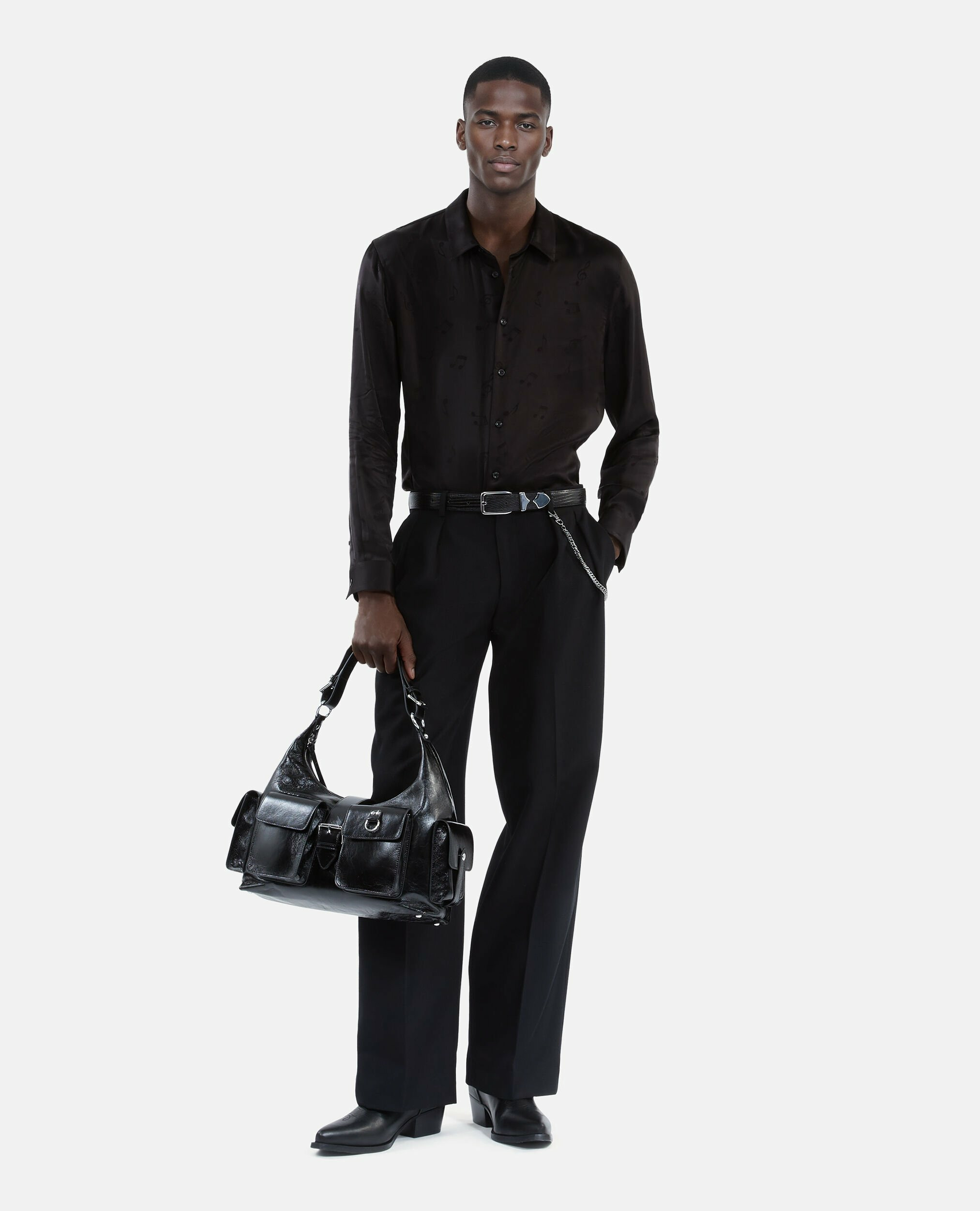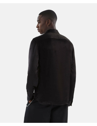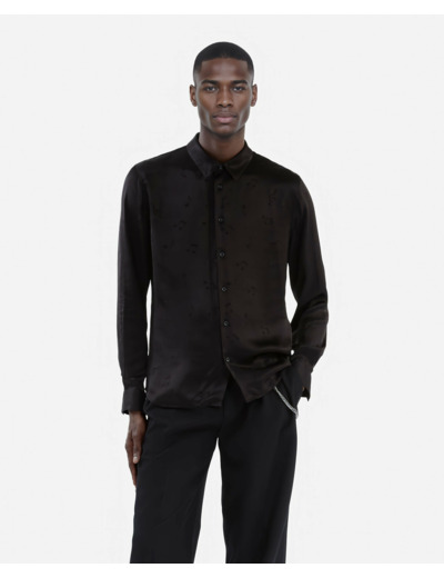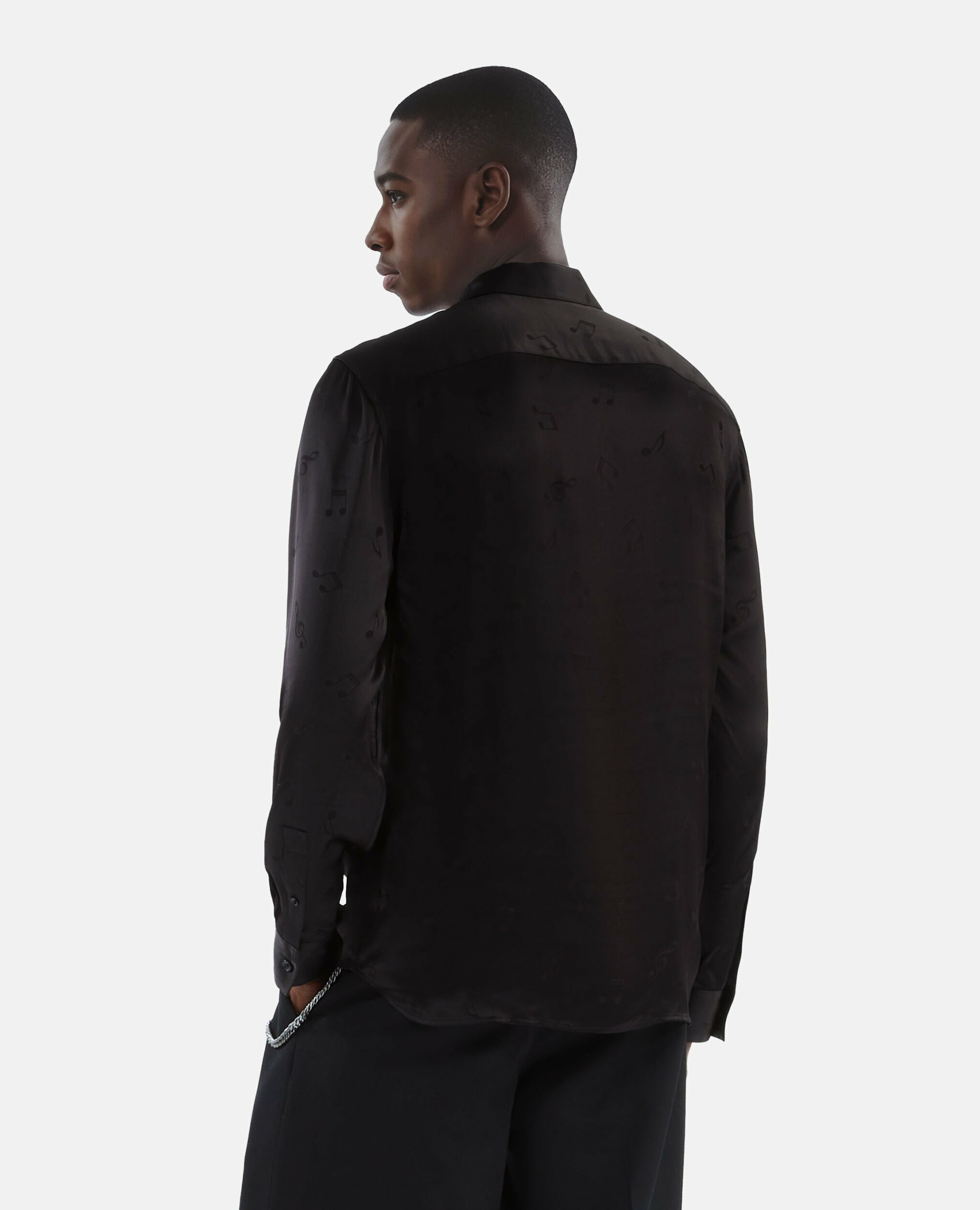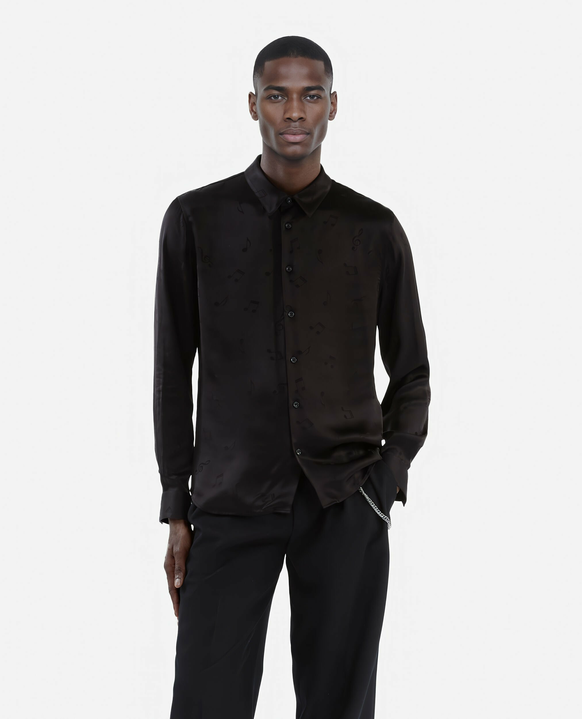 Fabriquée en jacquard musique, cette chemise présente une coupe droite avec col classique, manches longues, boutons noirs aux poignets et patte de boutonnage simple. La coupe ajustée nécessite parfois de choisir une taille au-dessus.