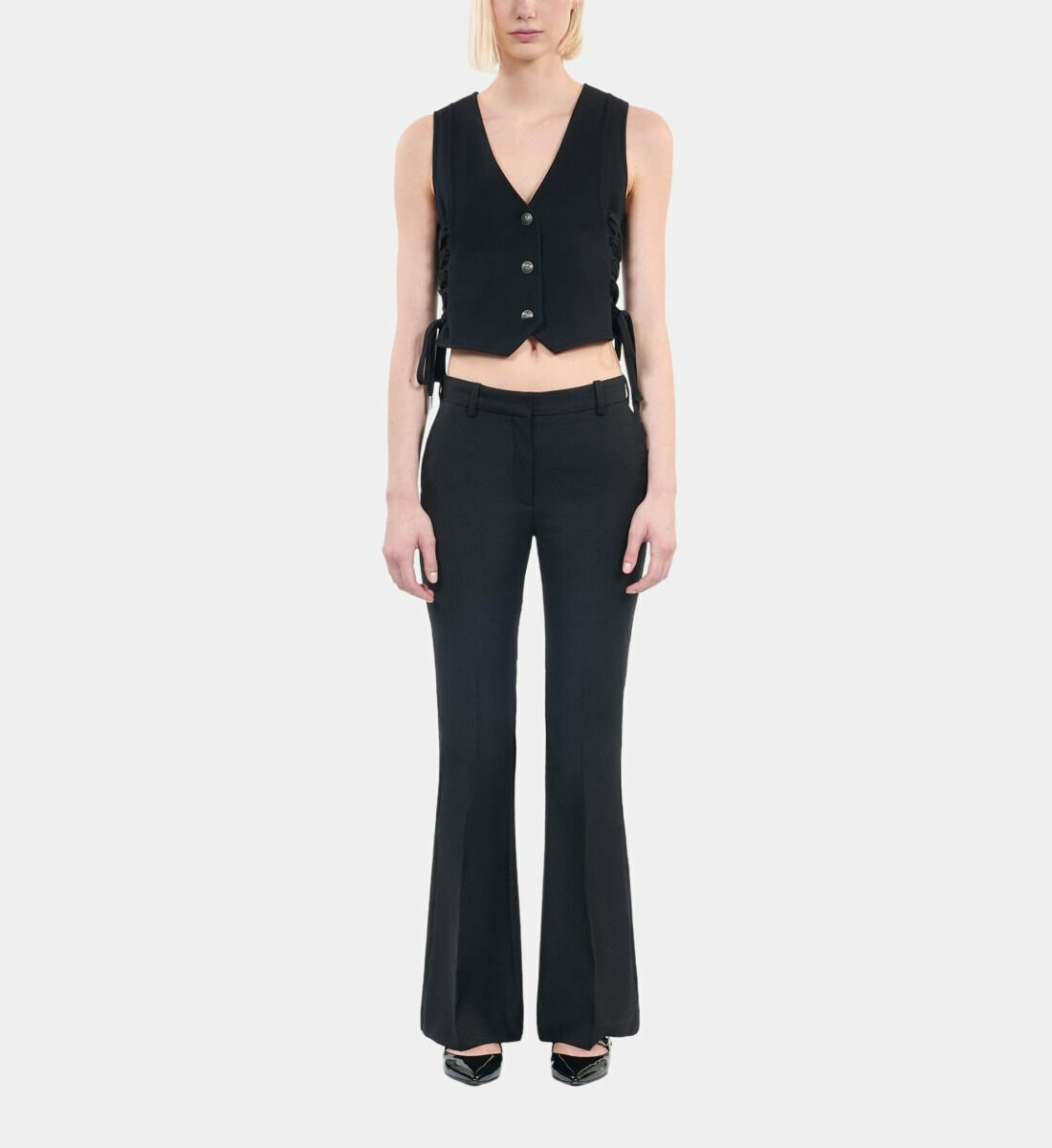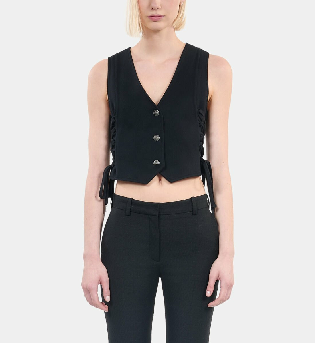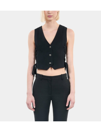 Adoptez l’élégance contemporaine avec ce gilet court noir signé The Kooples, sublimé par un laçage délicat qui affirme votre style avec subtilité. Une pièce versatile qui allie modernité et raffinement pour sublimer toutes vos tenues.