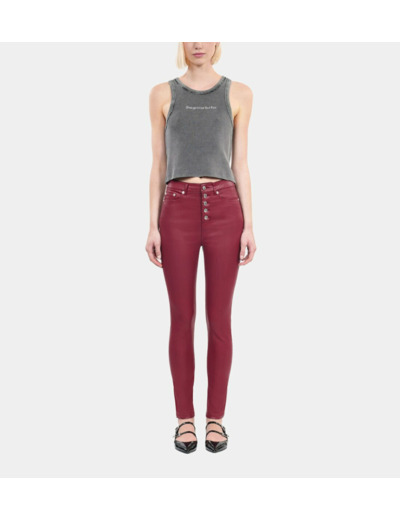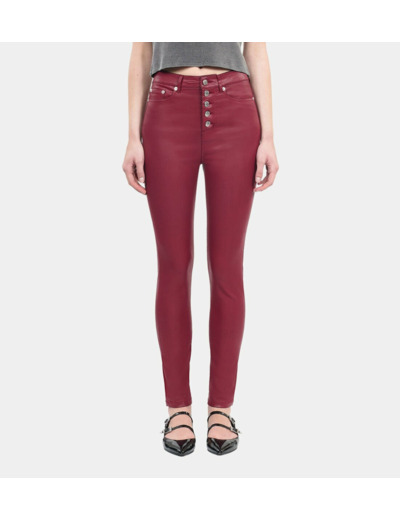 Conçu pour épouser parfaitement les formes, ce jean taille haute met en valeur la taille tout en offrant une liberté de mouvement grâce à sa coupe ajustée. Sa teinte rouge intense et son effet cuir apportent une touche rock et sophistiquée, idéale pour passer du jour à la nuit avec élégance. Les cinq poches pratiques et la fermeture à boutons complètent ce design pensé pour allier style et fonctionnalité.