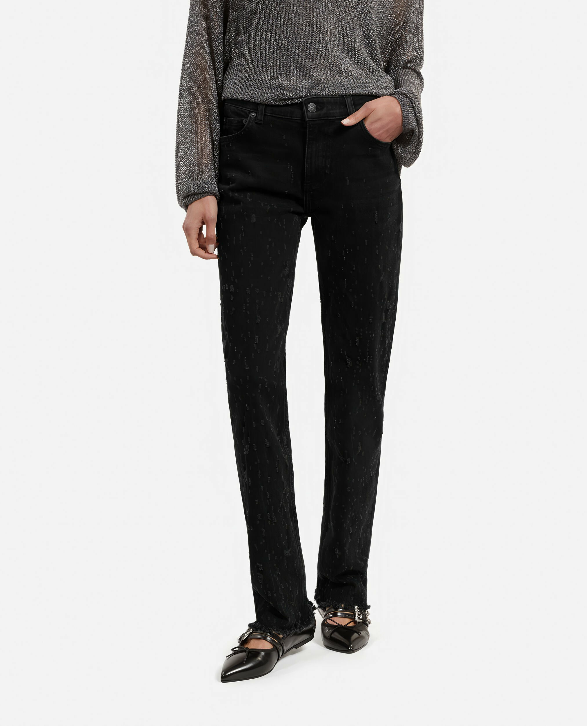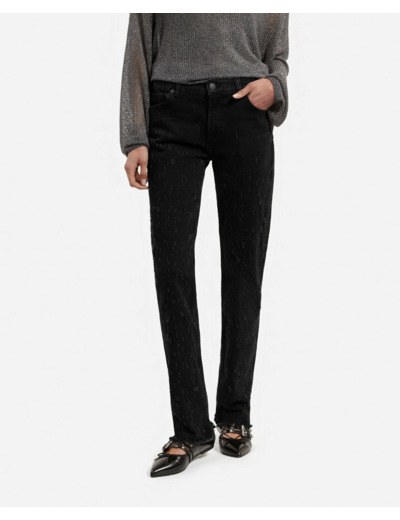 Jean femme The Kooples, coupe slim long, taille basse avec passants, fermeture à zip, cinq poches, détails d’abrasions pour un style authentique. Pour vous aider dans votre choix, n’hésitez pas à consulter notre Denim Guide.