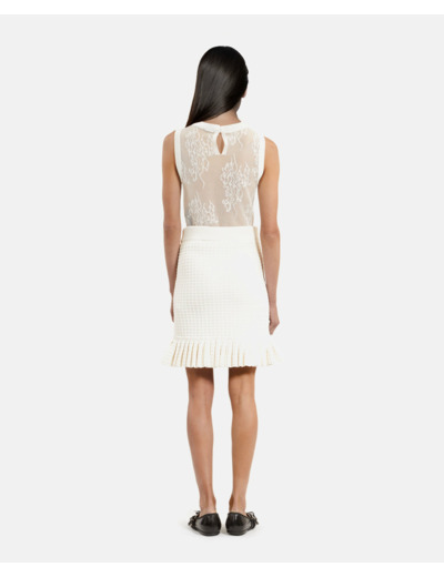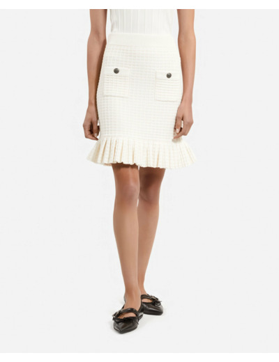 Réponse : Cette jupe est réalisée en maille, offrant confort et souplesse.