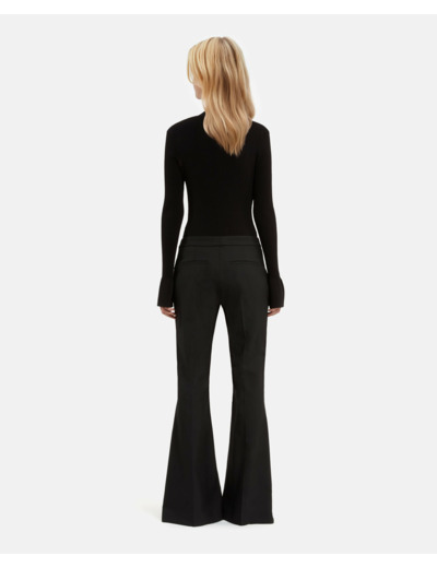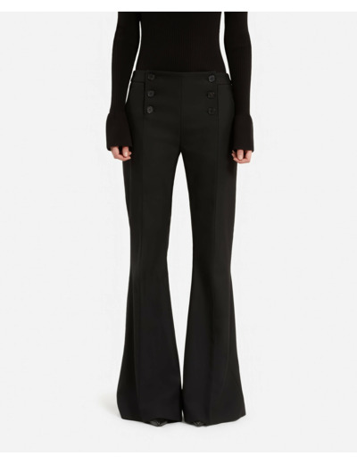 Pantalon femme The Kooples, taille haute, jambe flare, boutonnage devant. Poches latérales invisibles, poches passepoilées au dos. Boutons héritage. Composition et entretien disponibles sur demande.