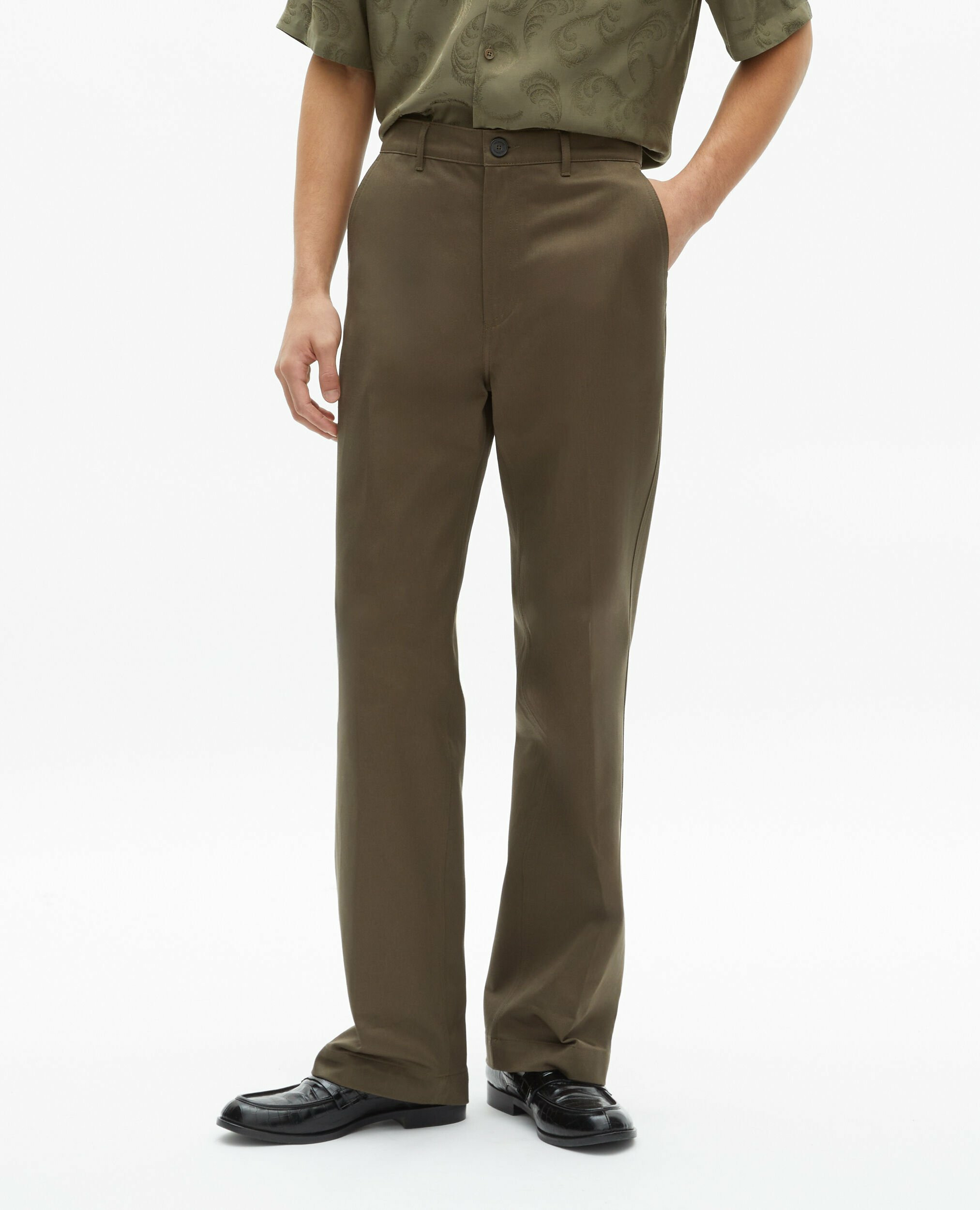 Ce pantalon homme The Kooples présente une taille moyenne avec passants, une jambe droite, des poches latérales italiennes, des poches dos passepoilées et une fermeture zippée avec bouton.