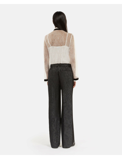 Pantalon femme The Kooples, taille moyenne avec passants, jambe droite, bandes en satin sur les côtés, fermeture zippée avec bouton de rappel et agrafe, poches latérales italiennes, poches passepoilées au dos.