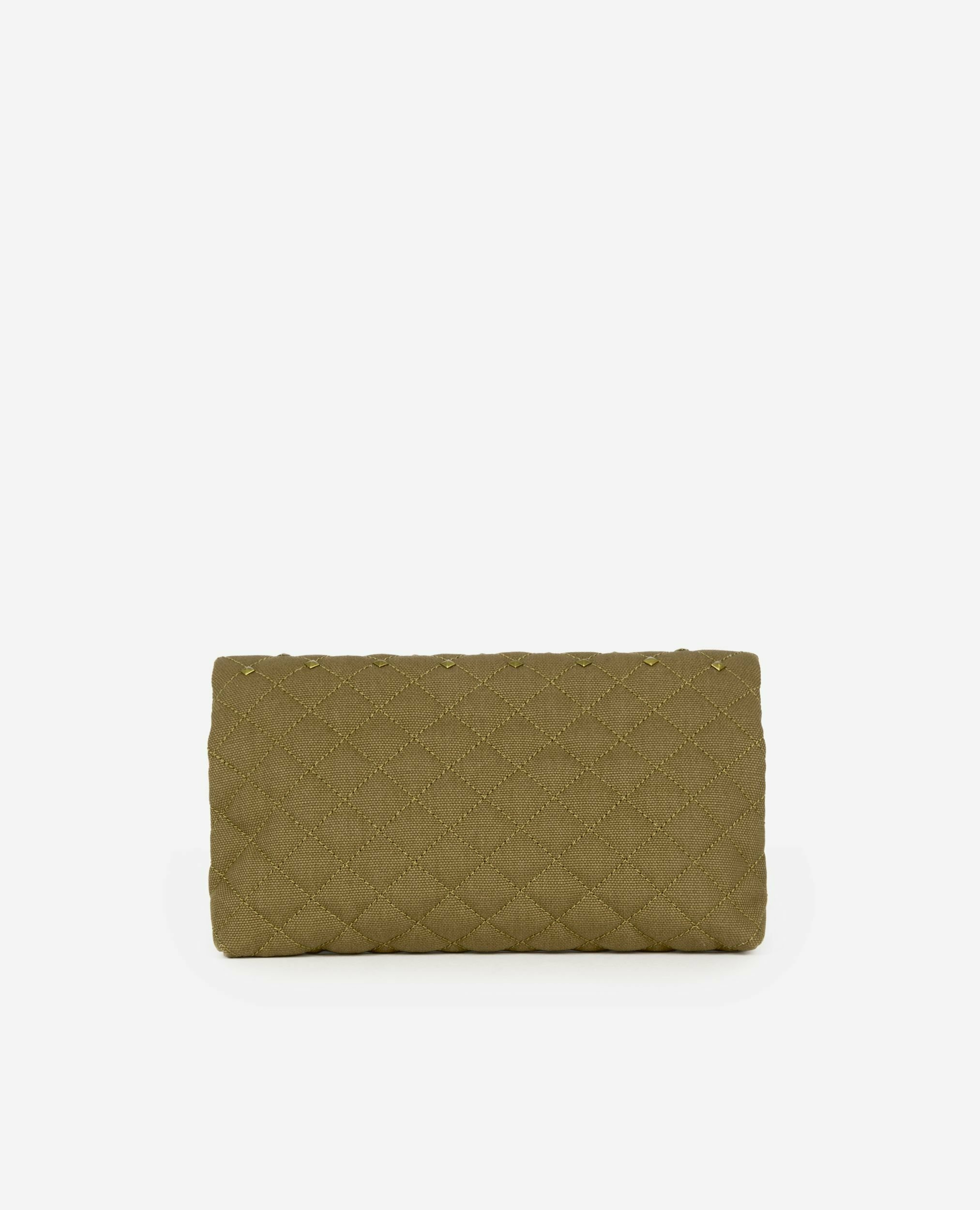 Réponse. La pochette est en canvas, un tissu résistant et léger, agrémenté de métallerie dorée.