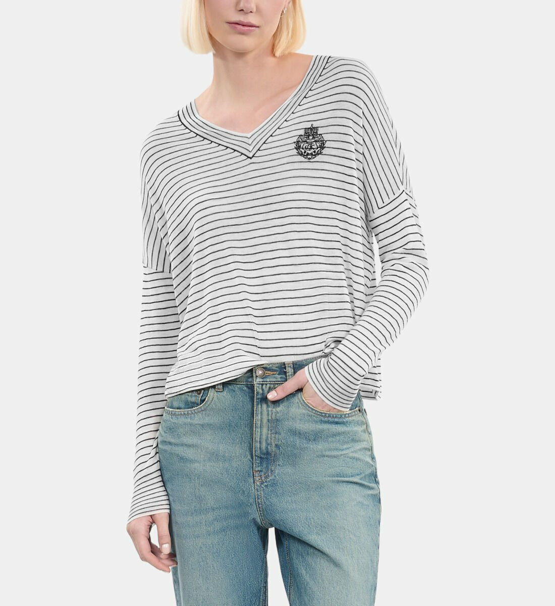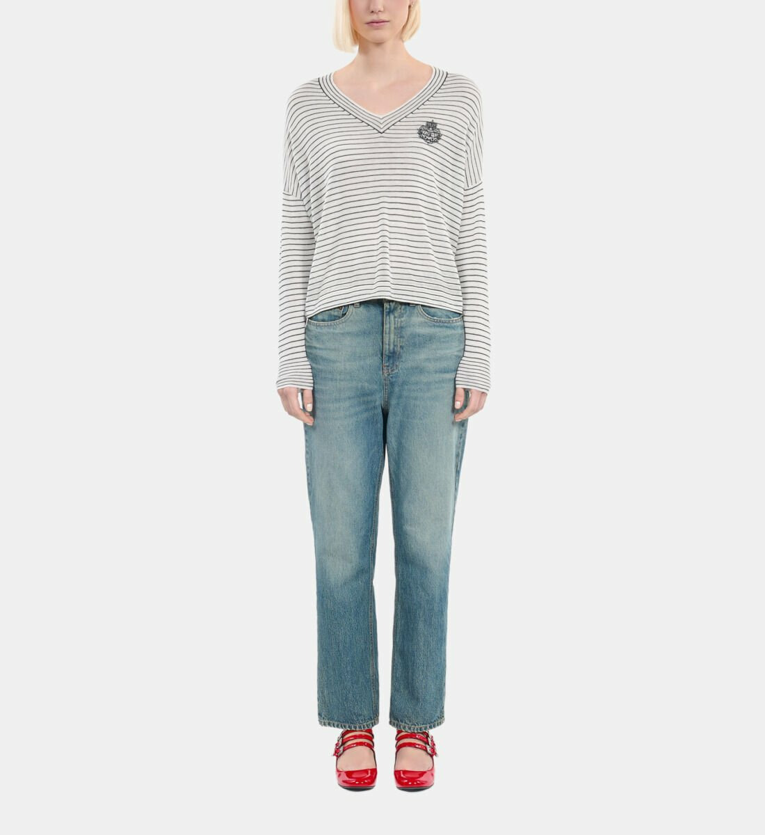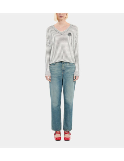 Conçu pour les femmes qui recherchent une allure décontractée sans compromis sur la qualité, ce pull The Kooples séduit par sa coupe large et son col en V flatteur. Les rayures bleues et blanches apportent une touche graphique tandis que le blason brodé souligne l’identité de la marque avec subtilité. Idéal pour composer des looks casual-chic, il s’adapte parfaitement aux journées fraîches grâce à sa matière noble.