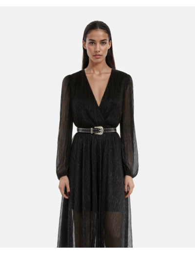 Conçue pour sublimer chaque mouvement, cette robe associe fils métallisés argentés et plissé soleil pour un effet lumineux et texturé. Sa coupe ajustée met en valeur la taille grâce à un élastique discret, tandis que le bas asymétrique apporte une touche contemporaine et dynamique. Les manches longues équilibrent parfaitement ce modèle, idéal pour une soirée ou un événement chic.
