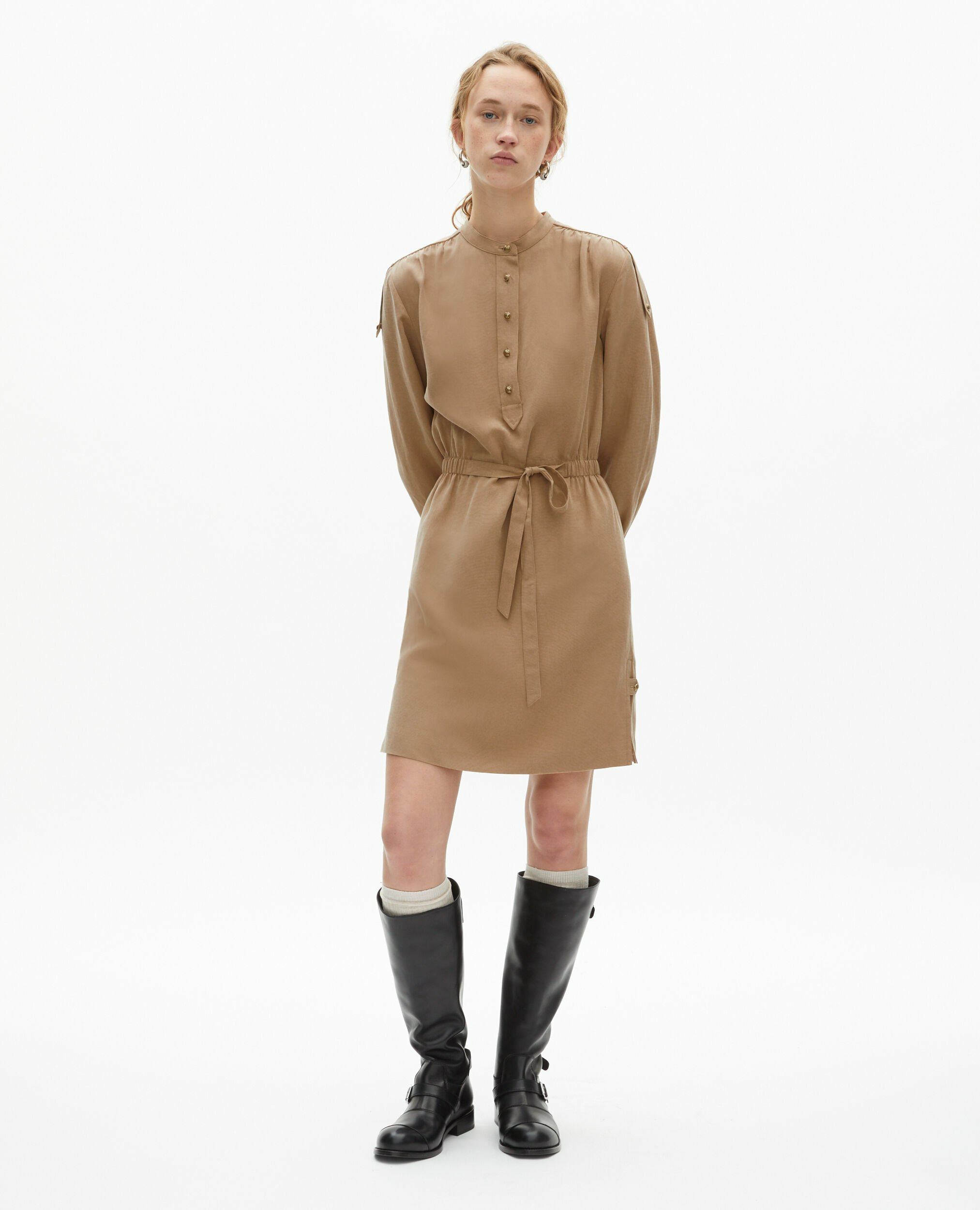 Conçue pour la femme contemporaine, cette robe se distingue par son col à patte de boutonnage et ses manches longues qui apportent une touche sophistiquée. La ceinture à coulisse intégrée souligne la taille avec finesse, tandis que les pattes d’épaules et les boutons héritage ajoutent un détail raffiné et unique. Sa longueur de 90,8 cm pour une taille 36 offre un équilibre parfait entre confort et féminité.