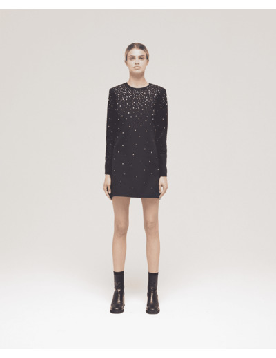 Conçue pour captiver, cette robe The Kooples épouse délicatement la silhouette grâce à sa coupe ajustée et son col rond classique. La fermeture boutonnée au dos ajoute une touche raffinée, tandis que les strass apportent une brillance subtile qui illumine chaque mouvement. Sa longueur, pensée pour flatter, s’adapte à votre taille pour un tombé impeccable.