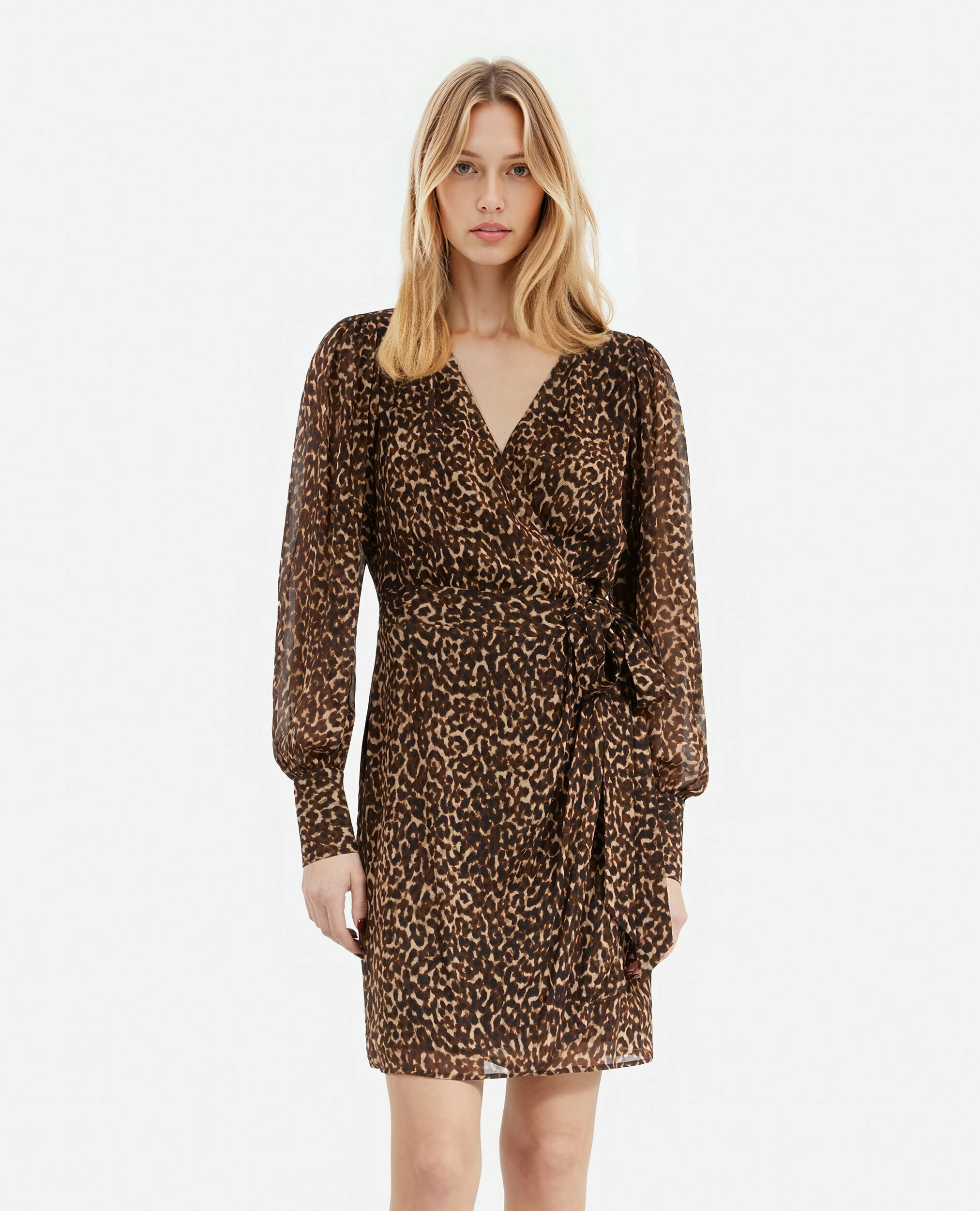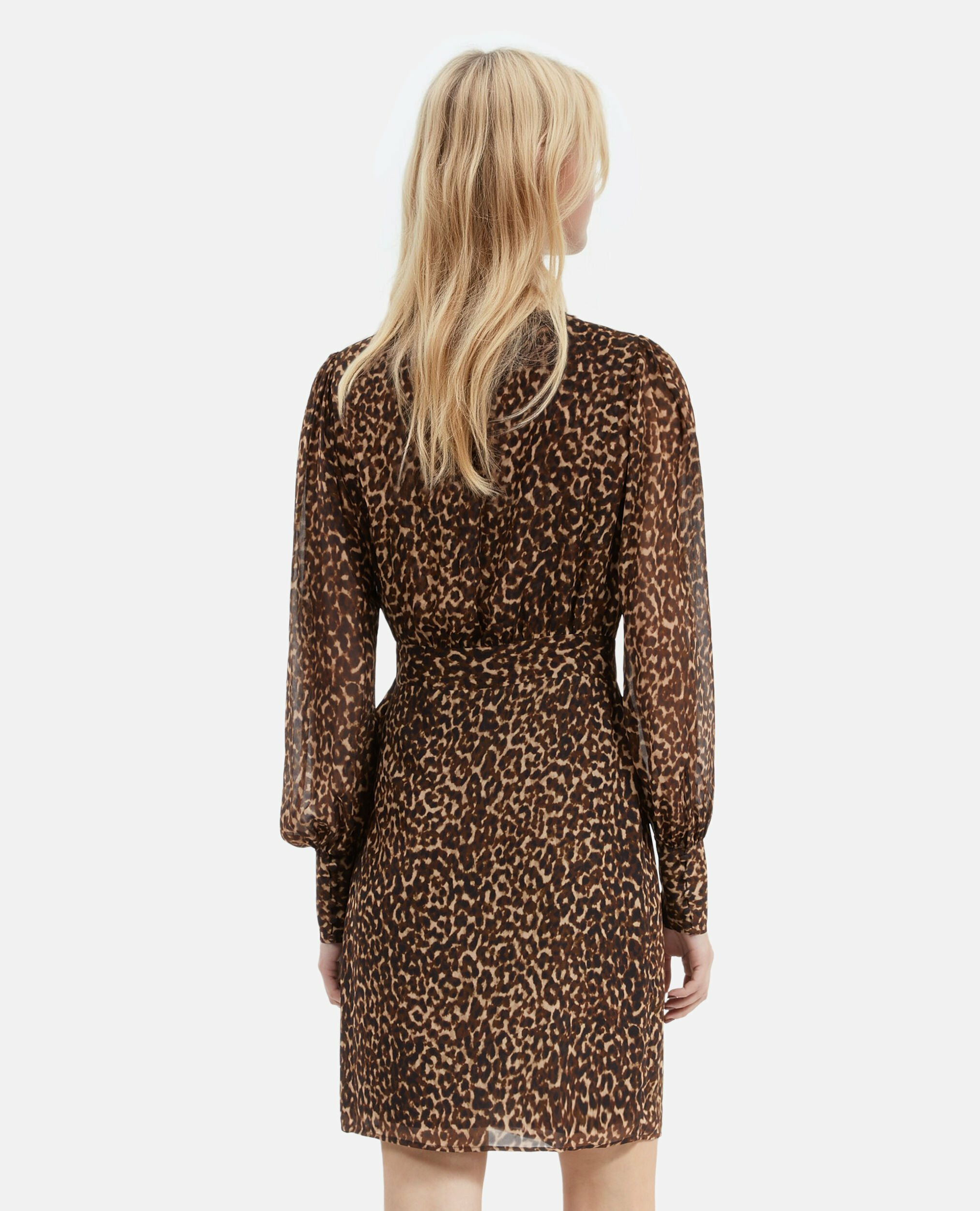 Robe femme The Kooples à imprimé léopard. Décolleté cache-cœur. Manches longues avec boutons aux poignets. Taille nouée pour un ajustement parfait. Longueur 93,3 cm pour une taille 36.