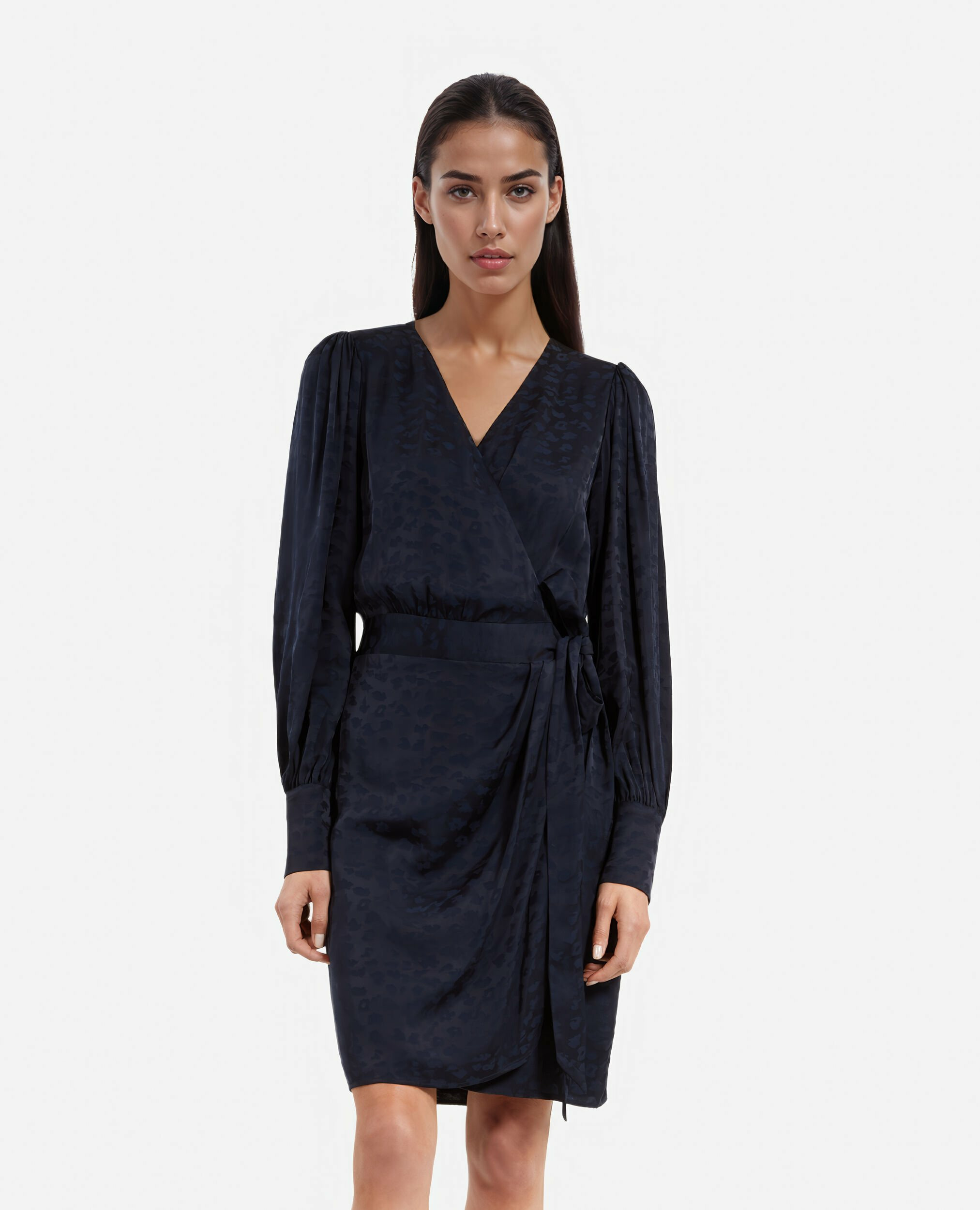 Affirmez votre style avec cette robe courte au décolleté cache-cœur, un équilibre parfait entre audace et élégance. Son jacquard léopard apporte une touche sauvage et sophistiquée à votre silhouette.
