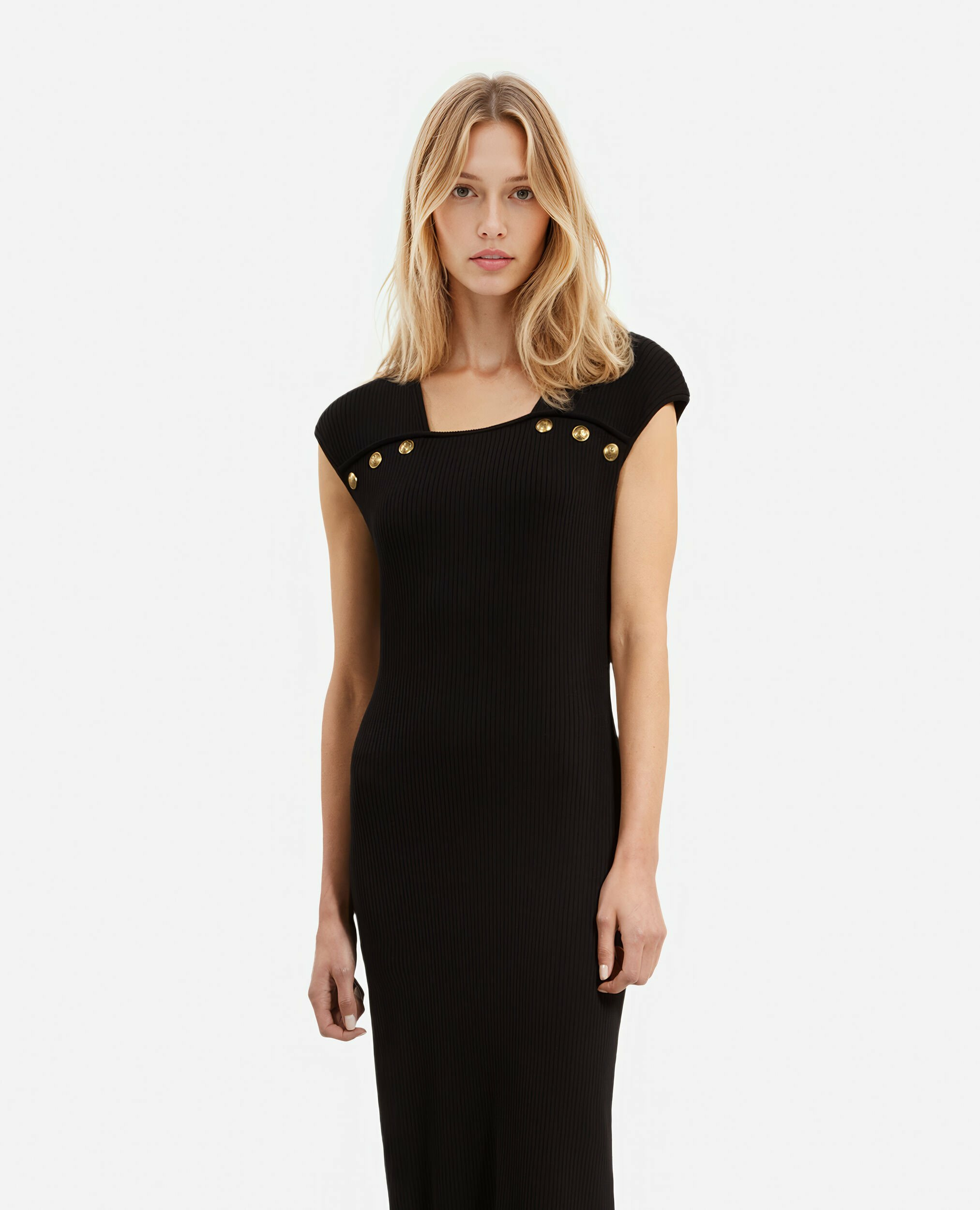 Conçue en maille côtelée, cette robe ajustée épouse parfaitement les formes tout en offrant un confort optimal. Son design sans manches met en valeur les épaules, sublimées par des épaulettes discrètes et des boutons héritage qui apportent une touche d’authenticité et de caractère. Sa longueur de 119 cm pour une taille 36 assure une élégance fluide, idéale pour toutes vos occasions.
