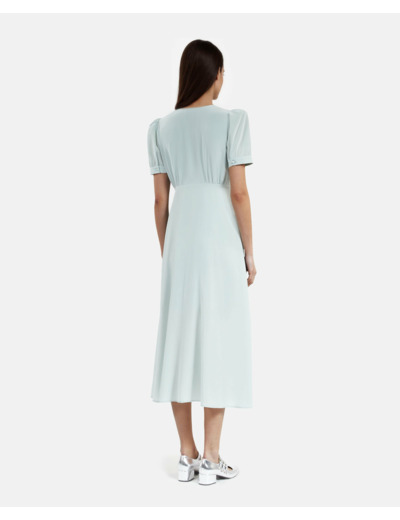 Conçue pour épouser délicatement vos formes, cette robe à manches courtes dévoile un col en V flatteur et une taille empire qui souligne la finesse de la taille. Les boutons recouverts et la fente avant apportent une touche sophistiquée et féminine, tandis que la longueur de 120 cm pour une taille 36 assure une allure élancée et gracieuse.