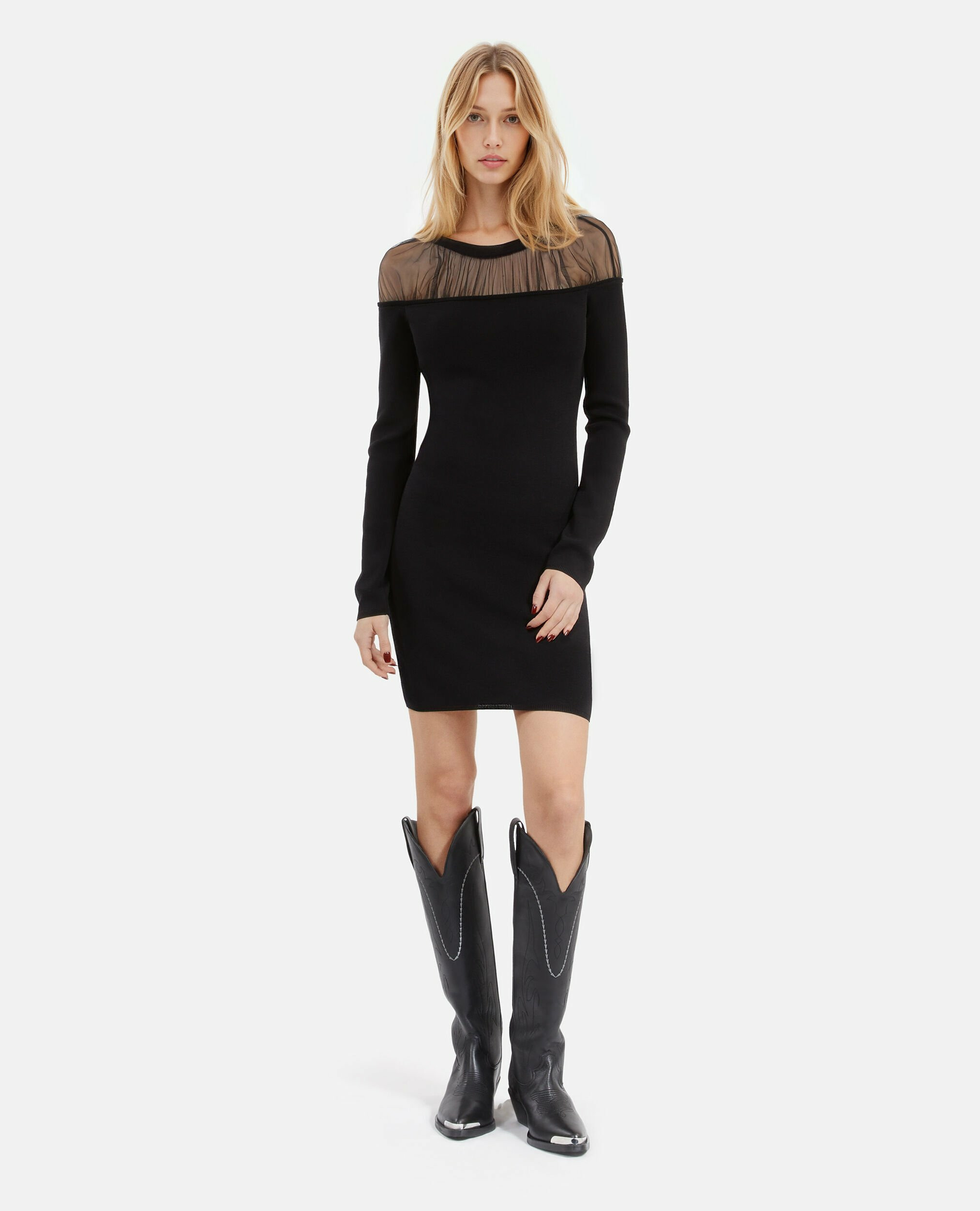 Conçue pour épouser parfaitement les formes, cette robe ajustée met en valeur la taille grâce à sa coupe précise. Le col rond et les manches longues apportent une touche classique, tandis que les détails en tulle froncé insufflent une note de légèreté et de sophistication. Sa longueur maîtrisée garantit une allure chic et contemporaine, idéale pour vos soirées ou événements.