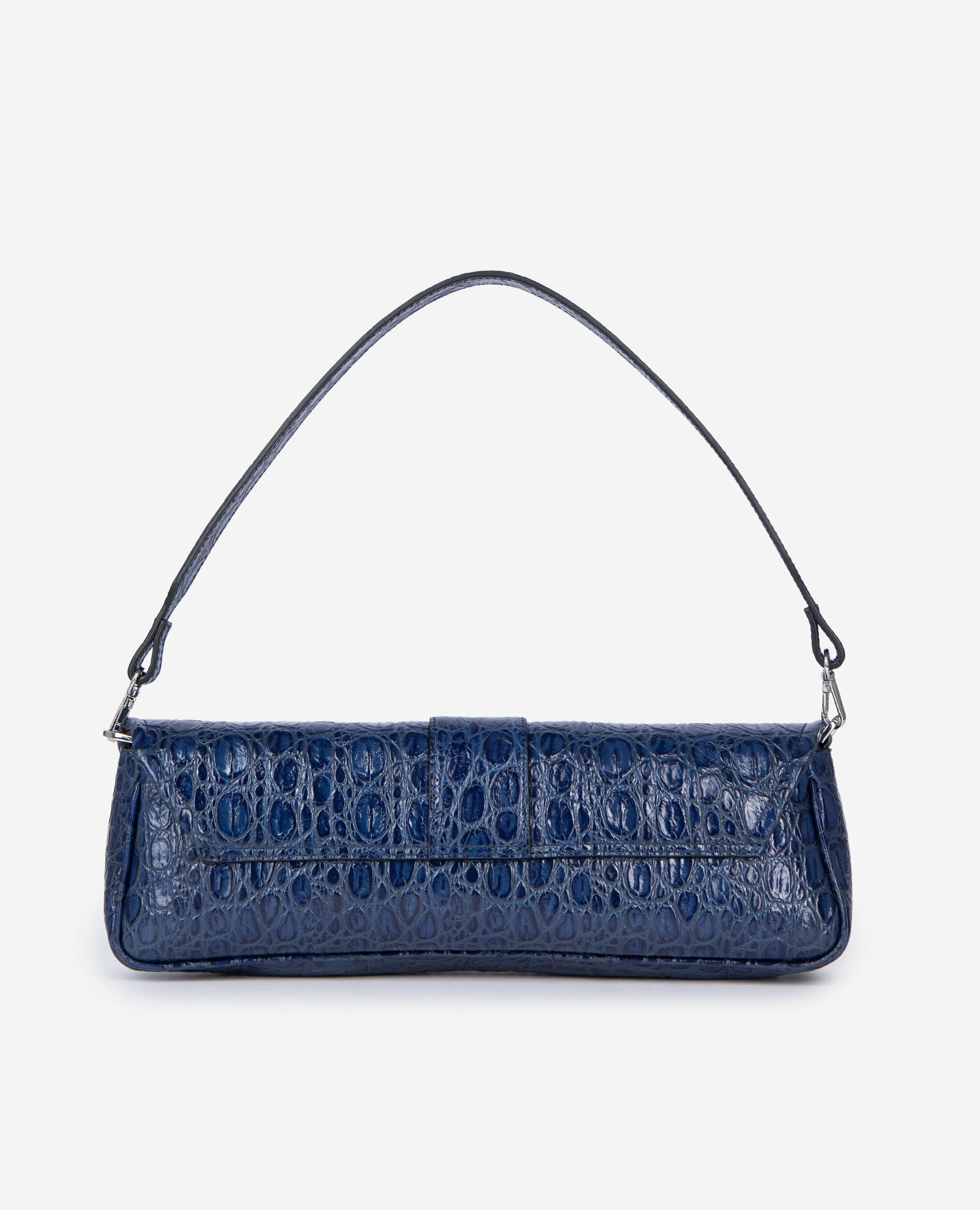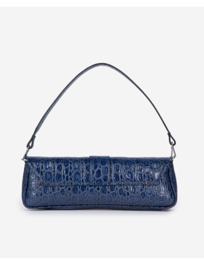 Dimensions : 13 x 38 x 6,5 cm. Composition : cuir embossé façon crocodile. Métallerie argentée. Anse et chaîne amovibles pour un porté personnalisé. Fermoir signature Emily. Poche intérieure plaquée.
