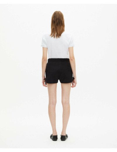 Réponse. Le short est orné de nœuds sur les côtés et d’une broderie ton sur ton du blason The Kooples.