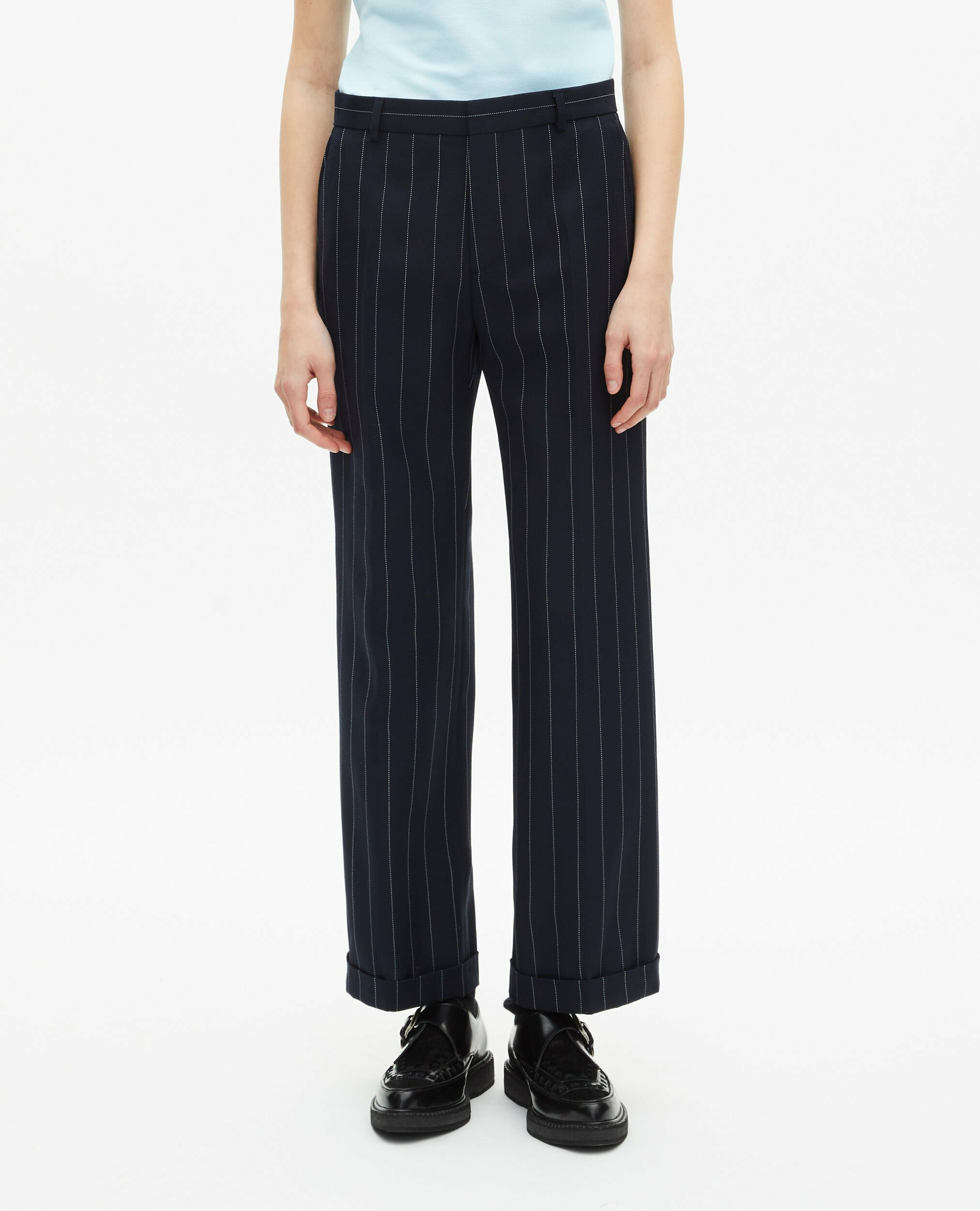 Pantalon femme en laine mélangée, taille moyenne avec passants, jambe droite à revers, poches latérales italiennes appliquées, plis devant, poches dos plaquées, fermeture zippée avec bouton de rappel et agrafe. Pour un look complet, associez-le à la veste coordonnée FVES30008KNAV01.