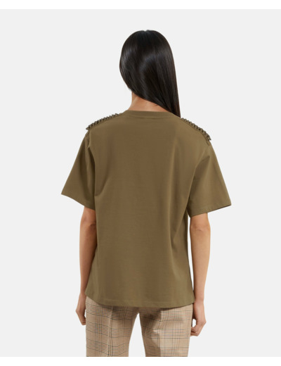 Question ? Quels sont les détails qui rendent ce T-shirt unique ? Réponse. Les chaînes aux épaules et les boutons héritage apportent une touche distinctive.