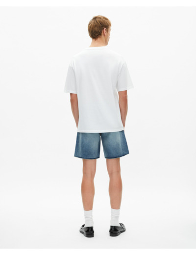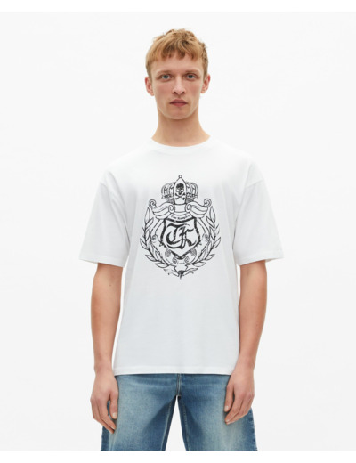 Réponse. Le t-shirt affiche une sérigraphie blason délavée, apportant une touche vintage et distinctive.