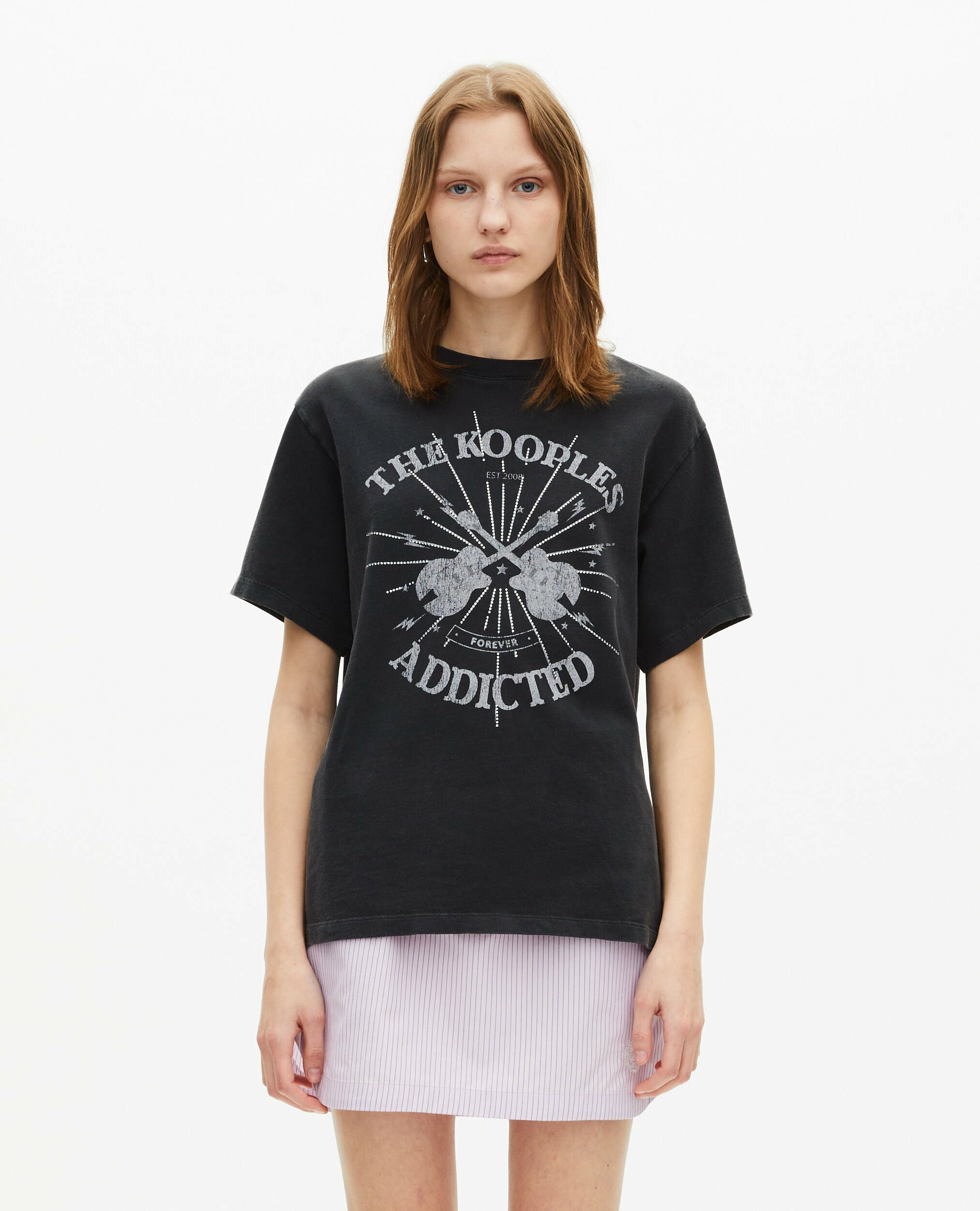 Confectionné en coton délavé, ce t-shirt oversize offre une silhouette décontractée et moderne. Le col rond et les manches courtes renforcent son esprit casual, idéal pour vos looks du quotidien ou vos sorties entre amis. La sérigraphie « The Kooples addicted » avec strass capte la lumière et affirme votre personnalité avec subtilité.