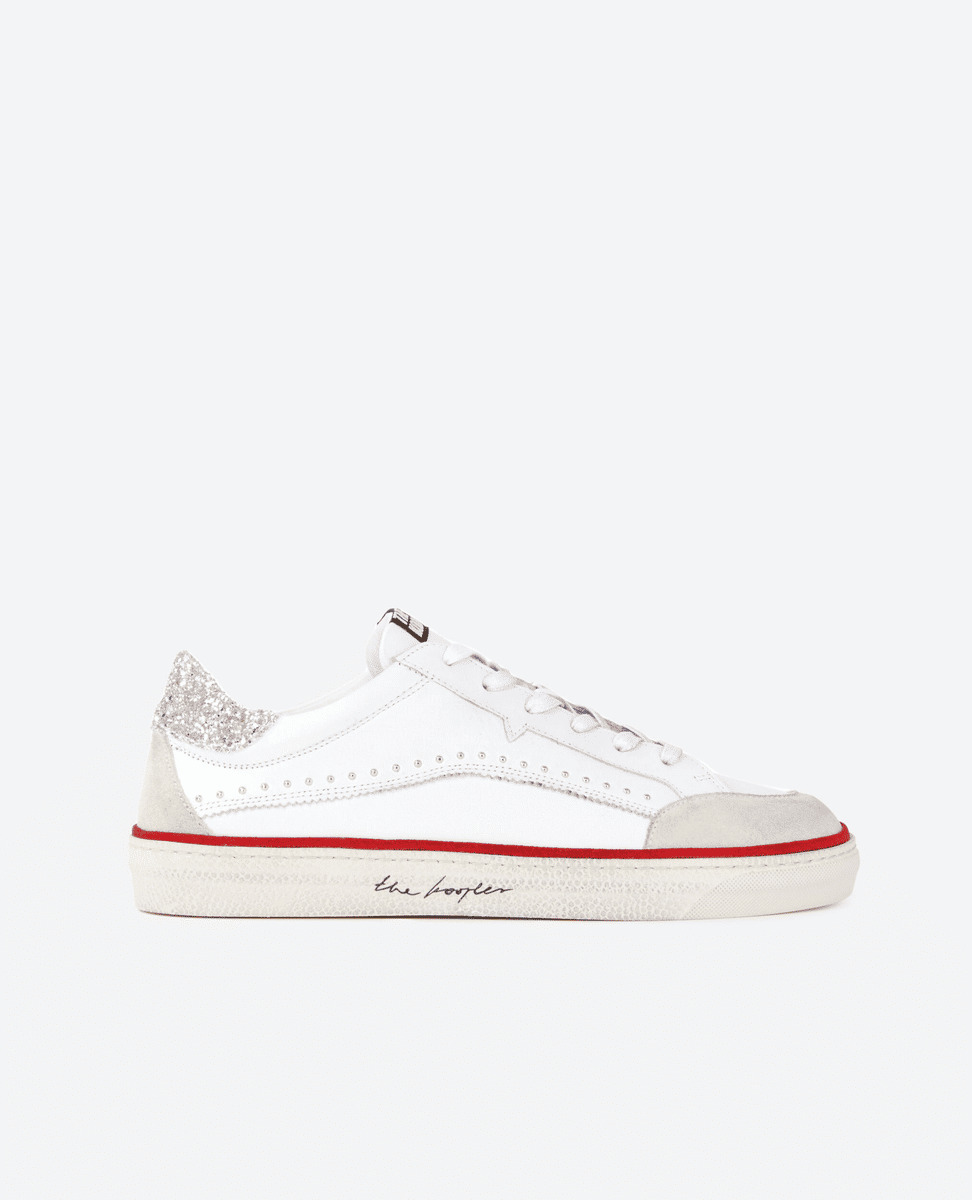 Affirmez votre style avec ces baskets en cuir blanc rehaussées d’un contrefort à paillettes, alliant élégance et audace. Une touche de lumière subtile pour sublimer chaque pas.
