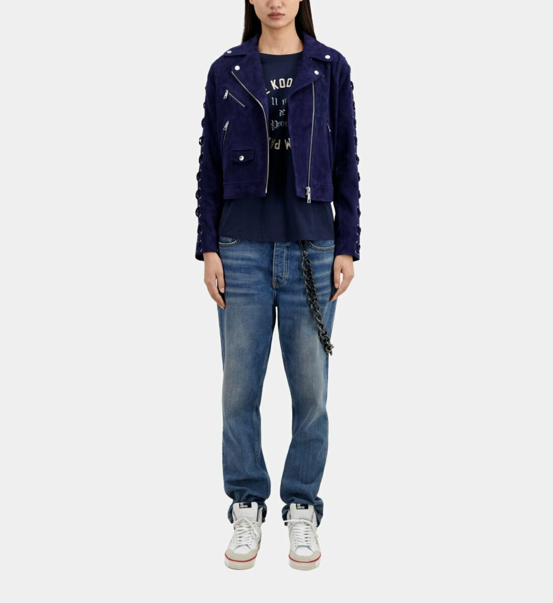 Confectionné en cuir de chèvre souple, ce blouson à manches courtes et col rond offre une silhouette moderne et légère. La sérigraphie discrète sur le devant apporte une touche graphique qui dynamise votre look sans le surcharger. Parfait pour les saisons intermédiaires, il se porte aussi bien en journée qu’en soirée.