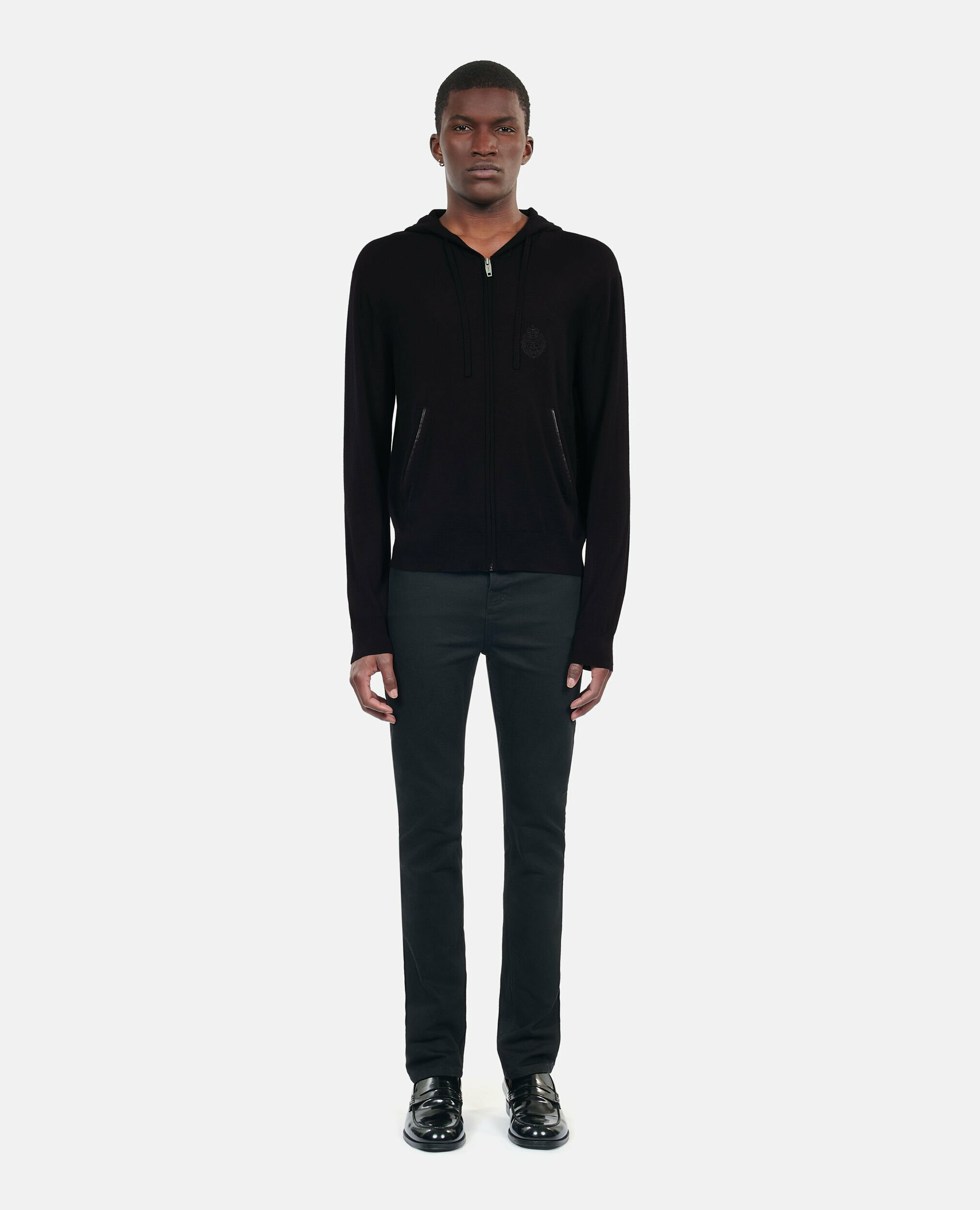 Confectionné en laine 100% pure, ce cardigan homme se distingue par sa coupe droite et sa capuche ajustable avec cordon de serrage, offrant une silhouette moderne et décontractée. La fermeture zippée et les poches kangourou renforcent son côté pratique, tandis que les bords côtes assurent une tenue impeccable. Idéal pour superposer sur un t-shirt ou une chemise, il accompagne parfaitement toutes vos tenues, du bureau aux sorties.