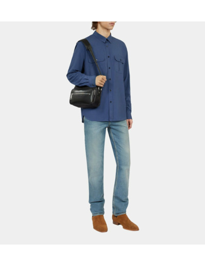 Cette chemise se distingue par sa coupe droite, un col classique, des manches longues avec poignets rivetés, une patte de boutonnage américaine, deux poches poitrine plaquées à rabat et des boutons noirs soigneusement sélectionnés.