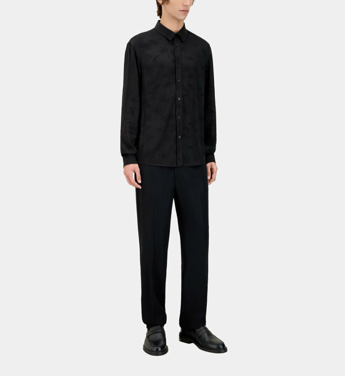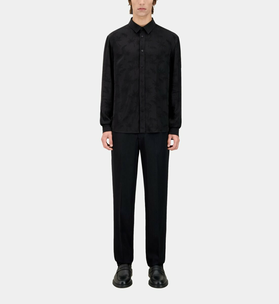 Affirmez votre style avec cette chemise jacquard noire ornée de palmiers, une pièce qui allie élégance et audace. Sa fluidité et son motif subtil apportent une touche contemporaine à votre garde-robe.