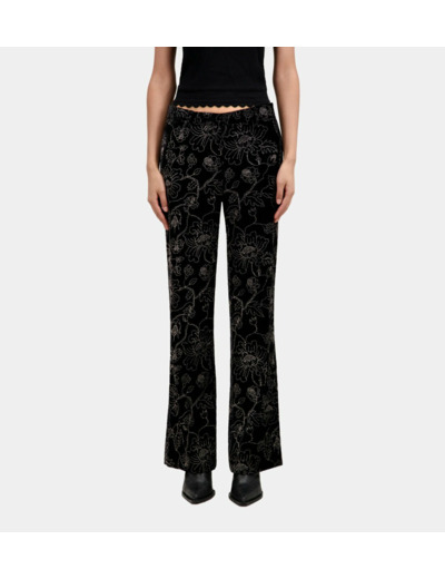 Conçu pour les femmes exigeantes, ce pantalon marie la douceur du velours à un imprimé fleuri scintillant qui capte la lumière sans en faire trop. Les poches latérales italiennes et les poches dos passepoilées ajoutent une touche fonctionnelle et raffinée, tandis que la fermeture zippée avec bouton et agrafe assure un maintien parfait.