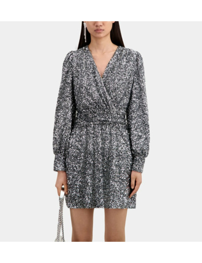 Composition : extérieur 100% polyester, doublure 100% polyester. Entretien : suivre les instructions spécifiques pour préserver l’éclat des sequins. Longueur : 90 cm pour une taille 36. Fermeture : zip invisible au dos.