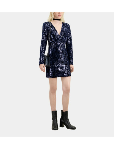 Sublimez vos soirées avec cette robe courte bleu marine en velours, ornée de sequins délicatement brodés. Une pièce élégante qui allie confort et raffinement pour un look résolument féminin.