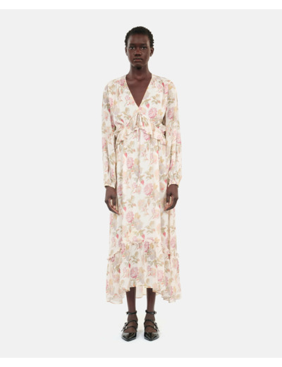 Conçue dans une soie fluide et délicate, cette robe dévoile un imprimé roses multicolore qui capte le regard sans effort. Son col en V et ses manches longues soulignent la silhouette tandis que la taille empire ajustée met en valeur la taille avec subtilité. Les volants apportent une touche de mouvement et de sophistication, rendant chaque geste gracieux. Doublée pour un confort optimal, elle accompagne vos journées et soirées avec une élégance naturelle.