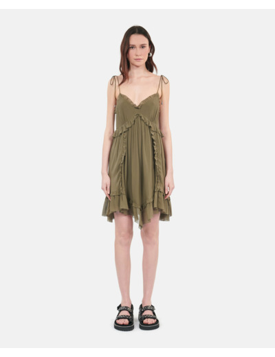 Sublimez votre silhouette avec cette robe courte kaki en soie signée The Kooples, une pièce alliant élégance et légèreté. Son coloris profond et ses détails raffinés en font un incontournable de votre garde-robe estivale.