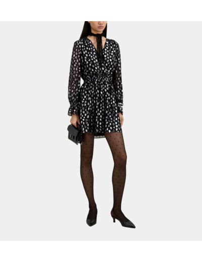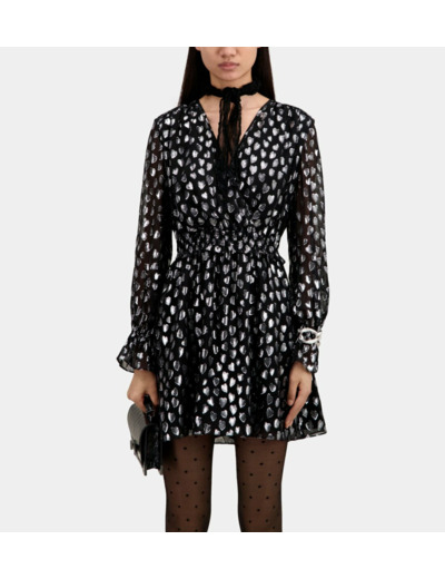 Sublimez votre allure avec cette robe courte noire ornée de cœurs argentés, un équilibre parfait entre élégance et modernité. Son décolleté cache-cœur et ses manches longues apportent une touche féminine et sophistiquée à votre silhouette.