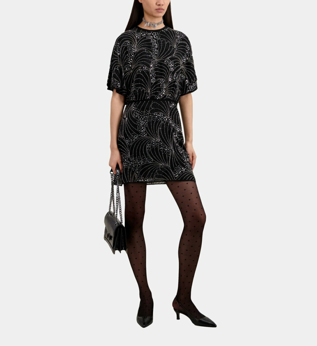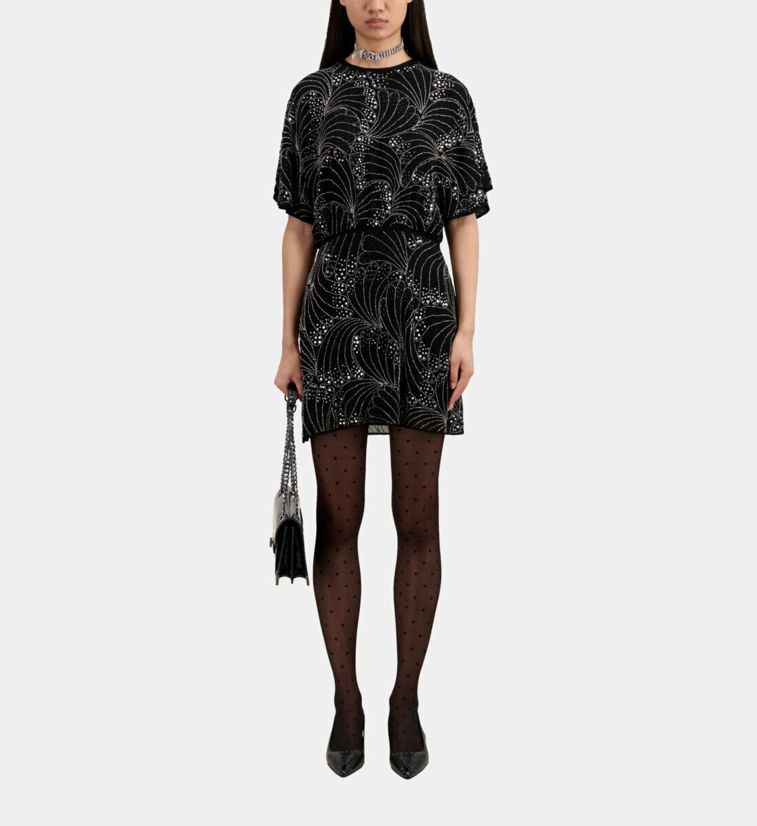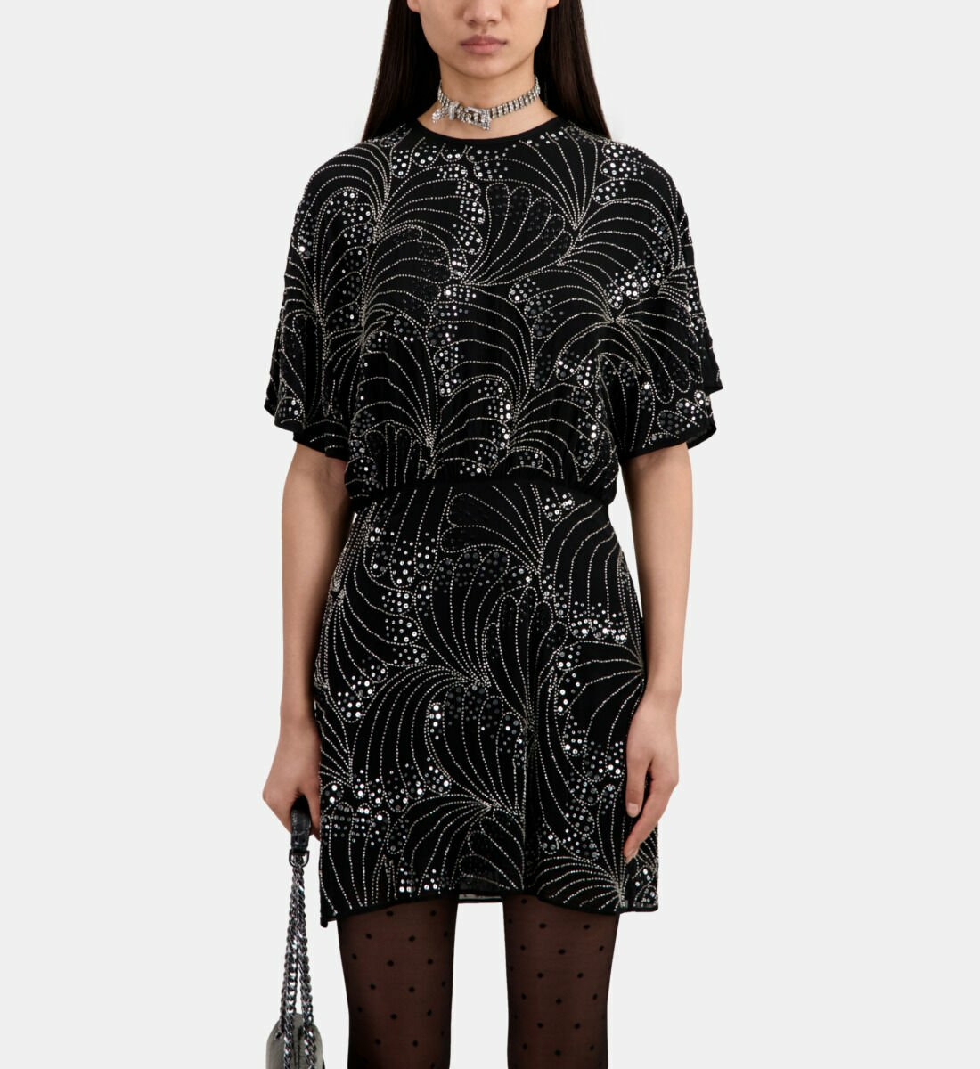 Sublimez vos soirées avec cette robe courte noire ornée de sequins et perles, une pièce qui allie élégance et modernité. Son design raffiné capte la lumière pour un effet glamour assuré.