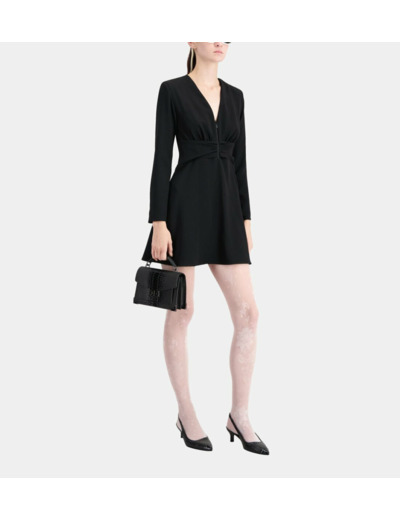 Sublimez votre silhouette avec cette robe courte noire en crêpe signée The Kooples, alliant élégance et modernité. Son décolleté en V zippé et ses manches longues apportent une touche audacieuse et raffinée à votre tenue.
