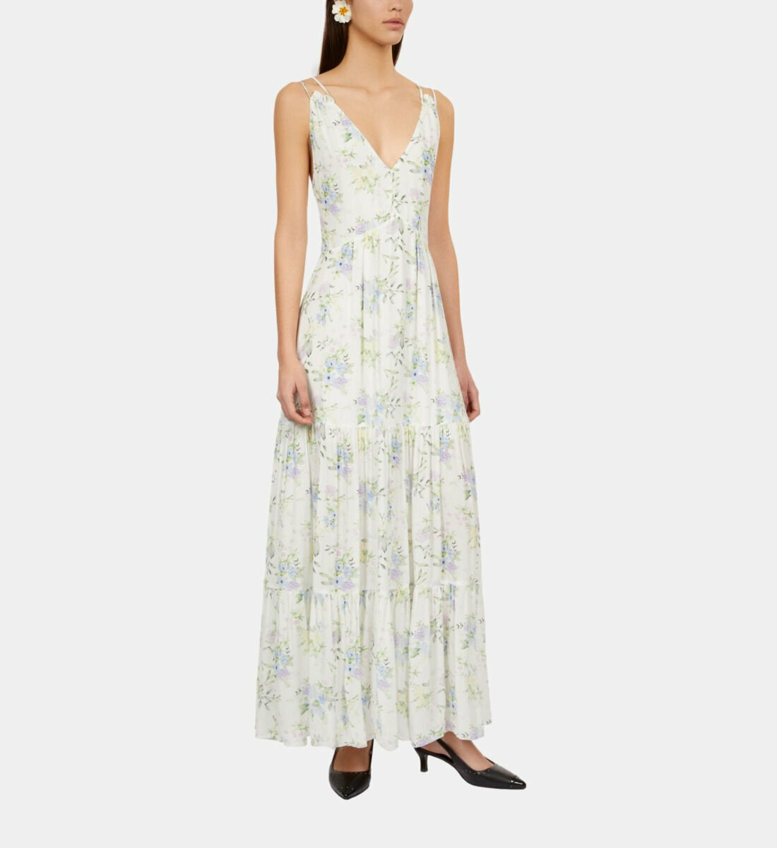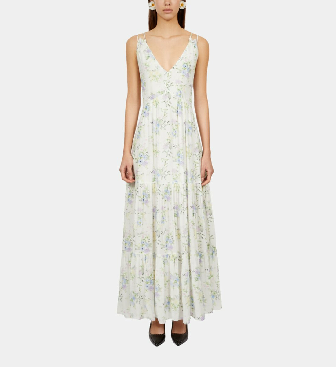 Cette robe longue mesure 113,5 cm pour une taille 36. Elle est signée The Kooples, gage de qualité et de style. Son imprimé fleuri multicolore, son décolleté en V, ses fines bretelles, ses volants à l’avant et son laçage au dos en font une pièce unique et facile à porter.